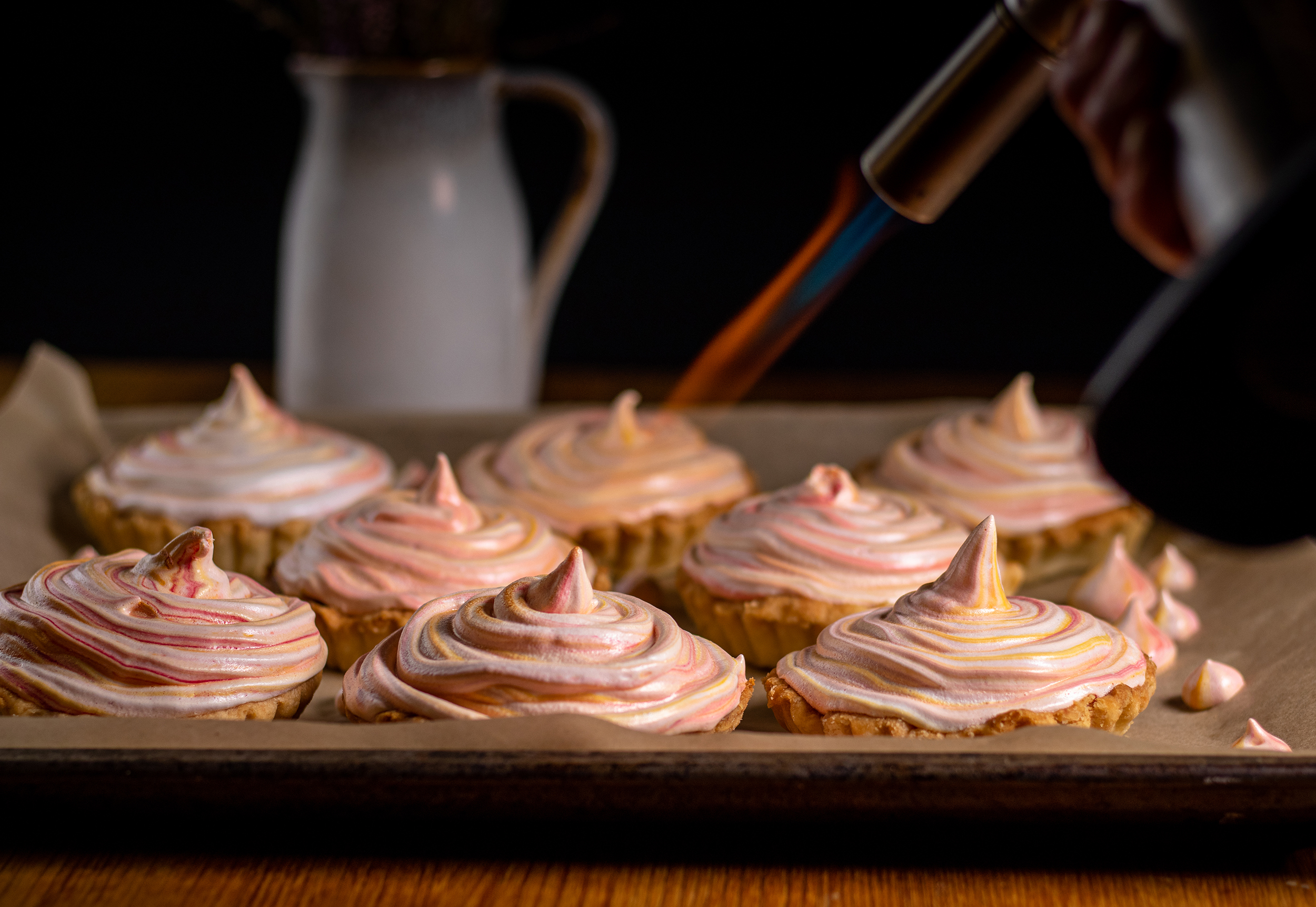 - Um eine leicht bräunliche, karamellisierte Kruste auf dem Baiser zu erreichen, am Ende noch kurz mit einem Gasbrenner flambieren. Aber Vorsicht: der Baiser kann dabei sehr schnell verbrennen.