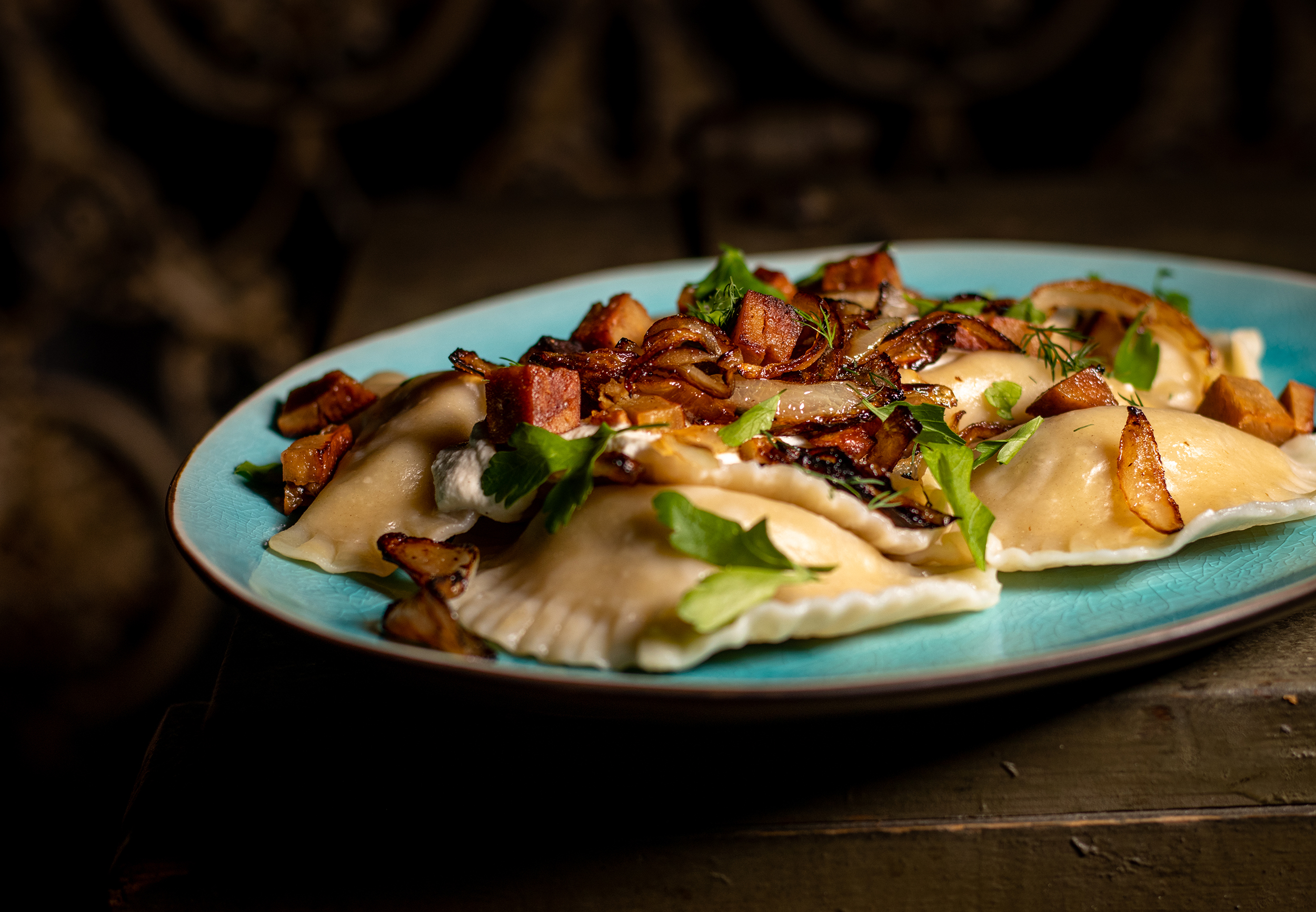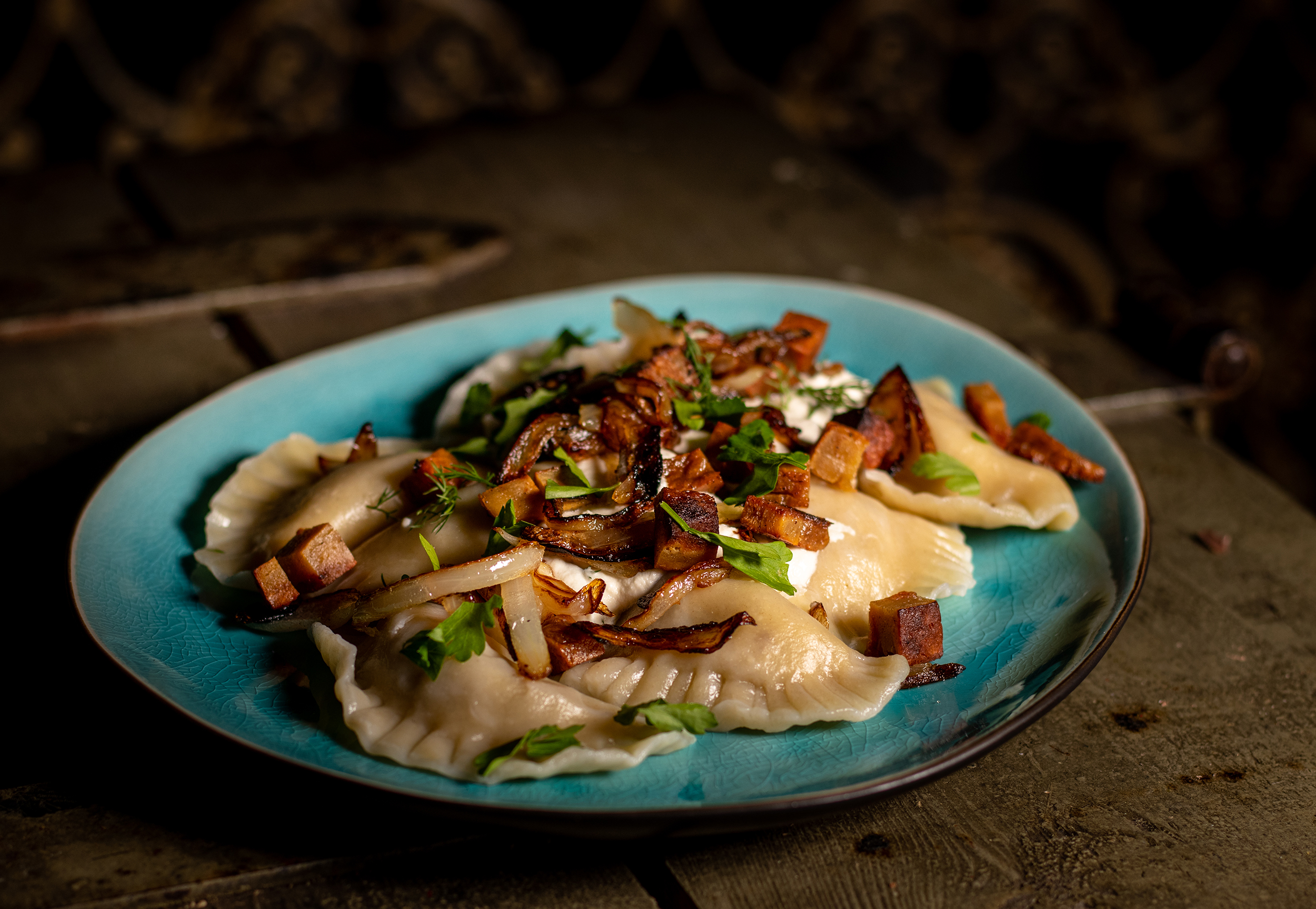 Ich liebe es Piroggen ganz simpel zu essen. Zum Beispiel einfach mit einigen angebratenen Streifen und Würfeln von meinem selbstgemachten, veganen Räucherschinken und ein paar karamellisierten Zwiebeln. Beides gebe ich dann einfach über die Pierogi.