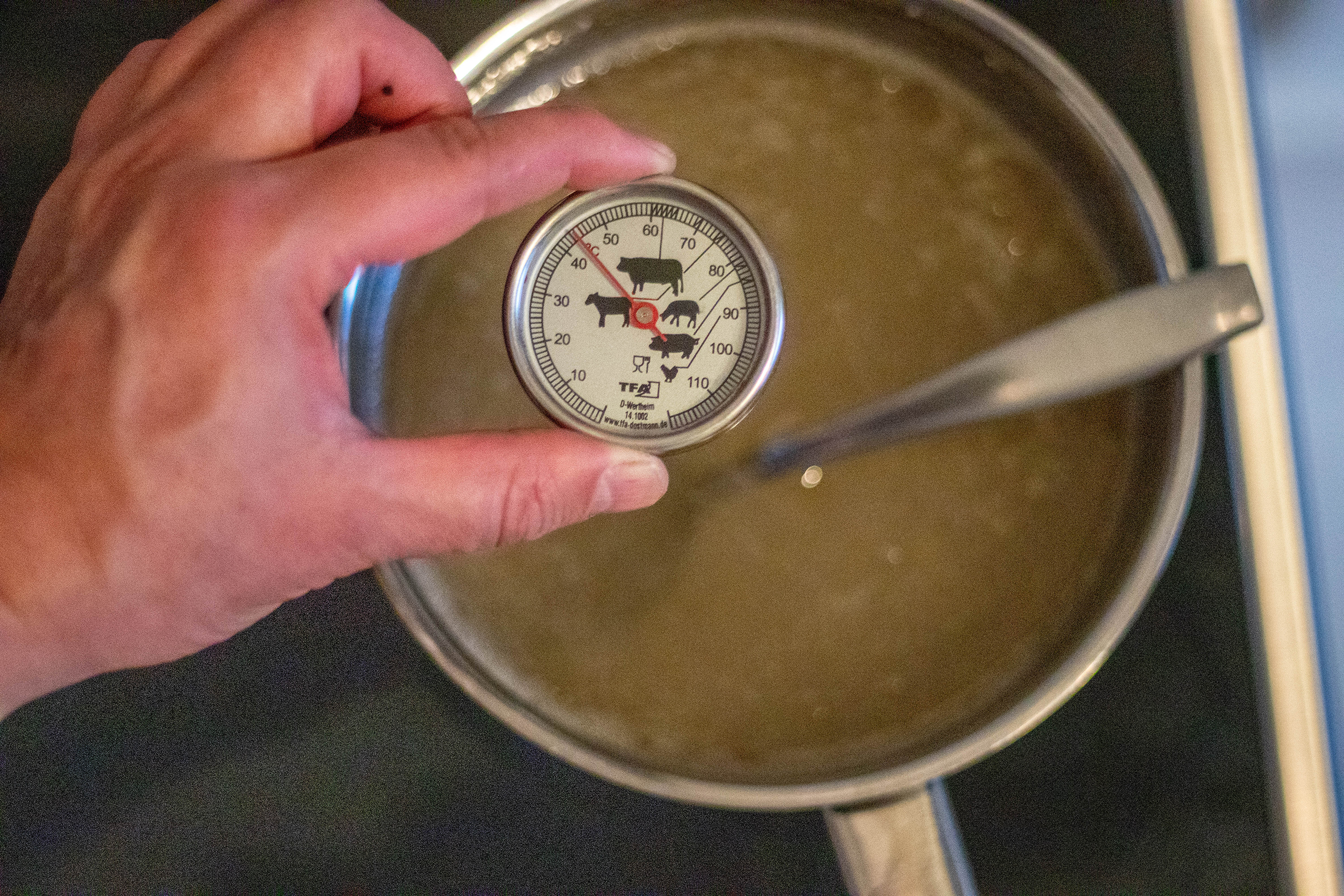 - Aufkochen lassen, bis exakt 100° erreicht sind. Dies genau mit einem Küchenthermometer messen.