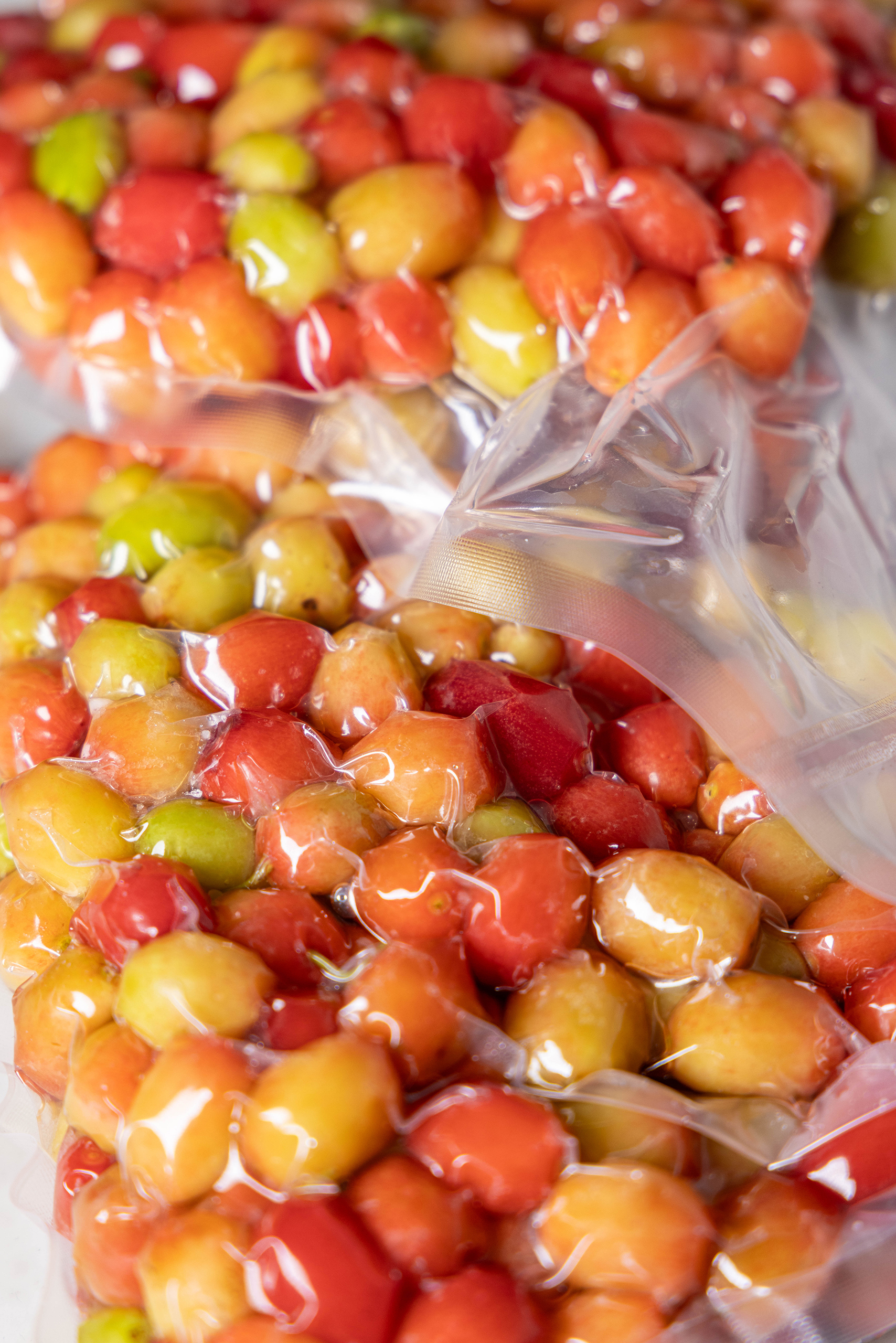 Ich habe 475 g Kornelkirschen, die ich auf 2 Vakuumierbeutel verteile.