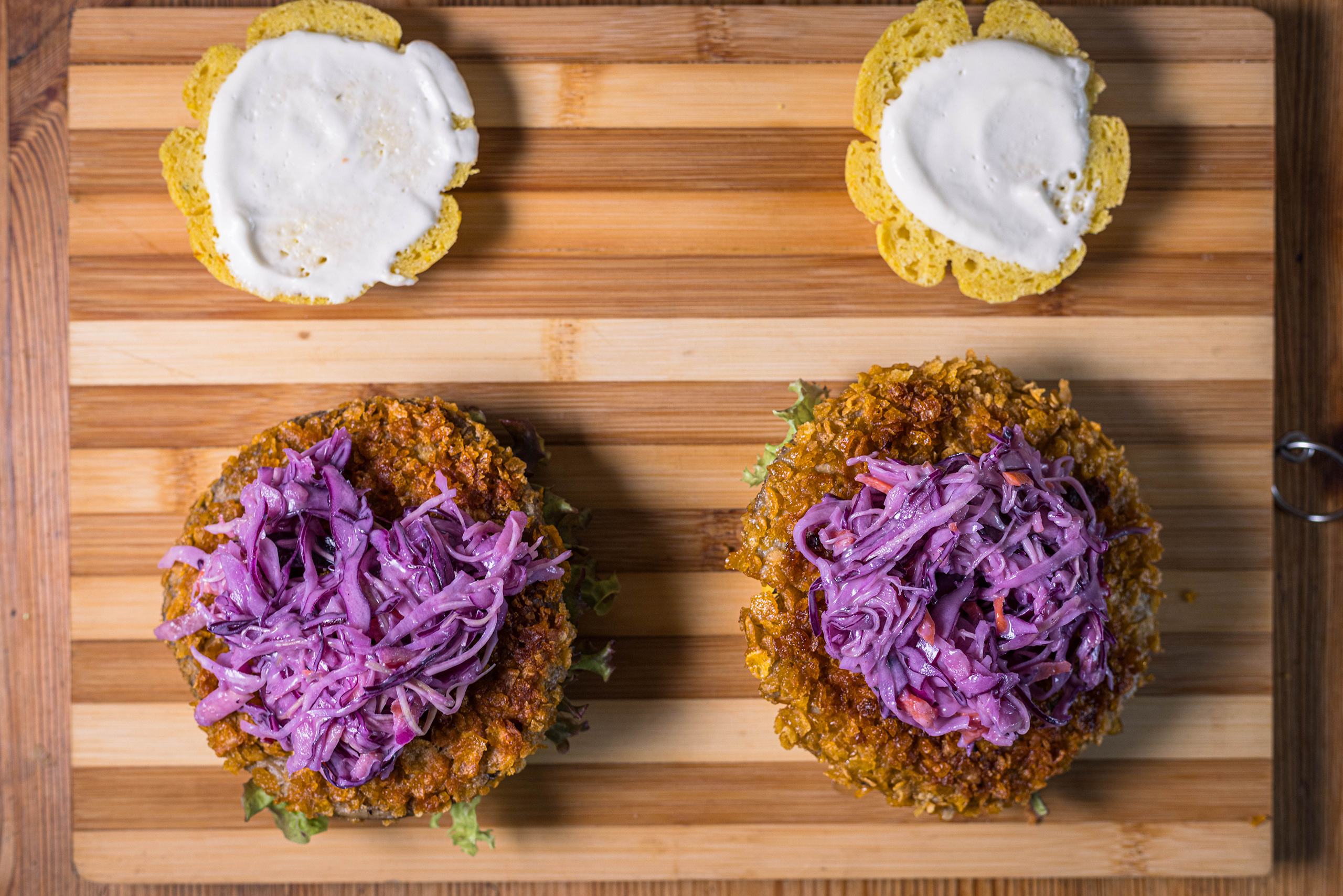 Parasolburger mit Coleslaw im Kürbisbun – vegan