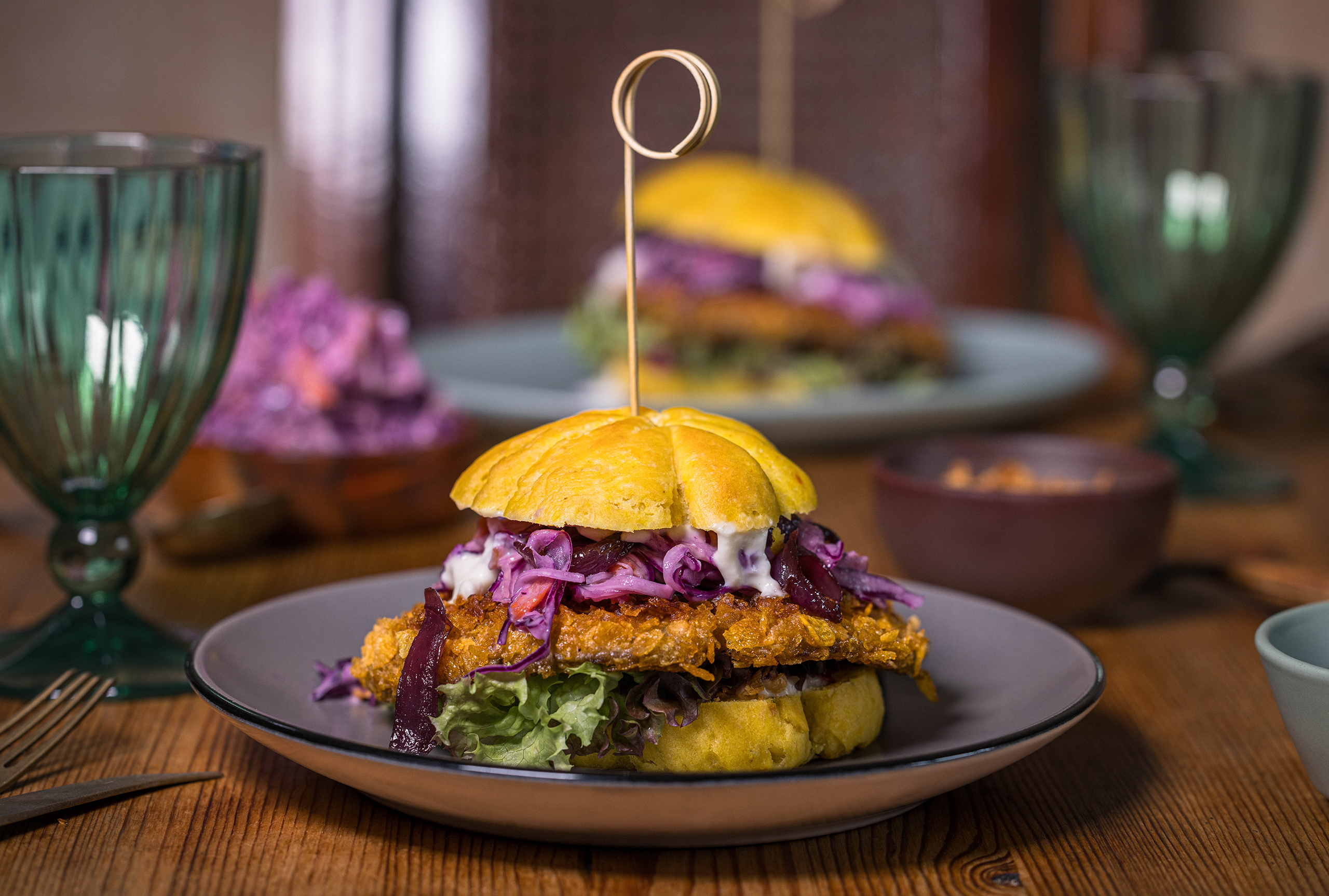 Mein herbstlicher Parasolpilz-Burger bringt viele kulinarische Komponenten des Herbstes, wie Pilze, Mais durch die Panade, Kohl, Möhre und Apfel im Coleslaw, Schlehen, sowie Kürbis im Bun zusammen.