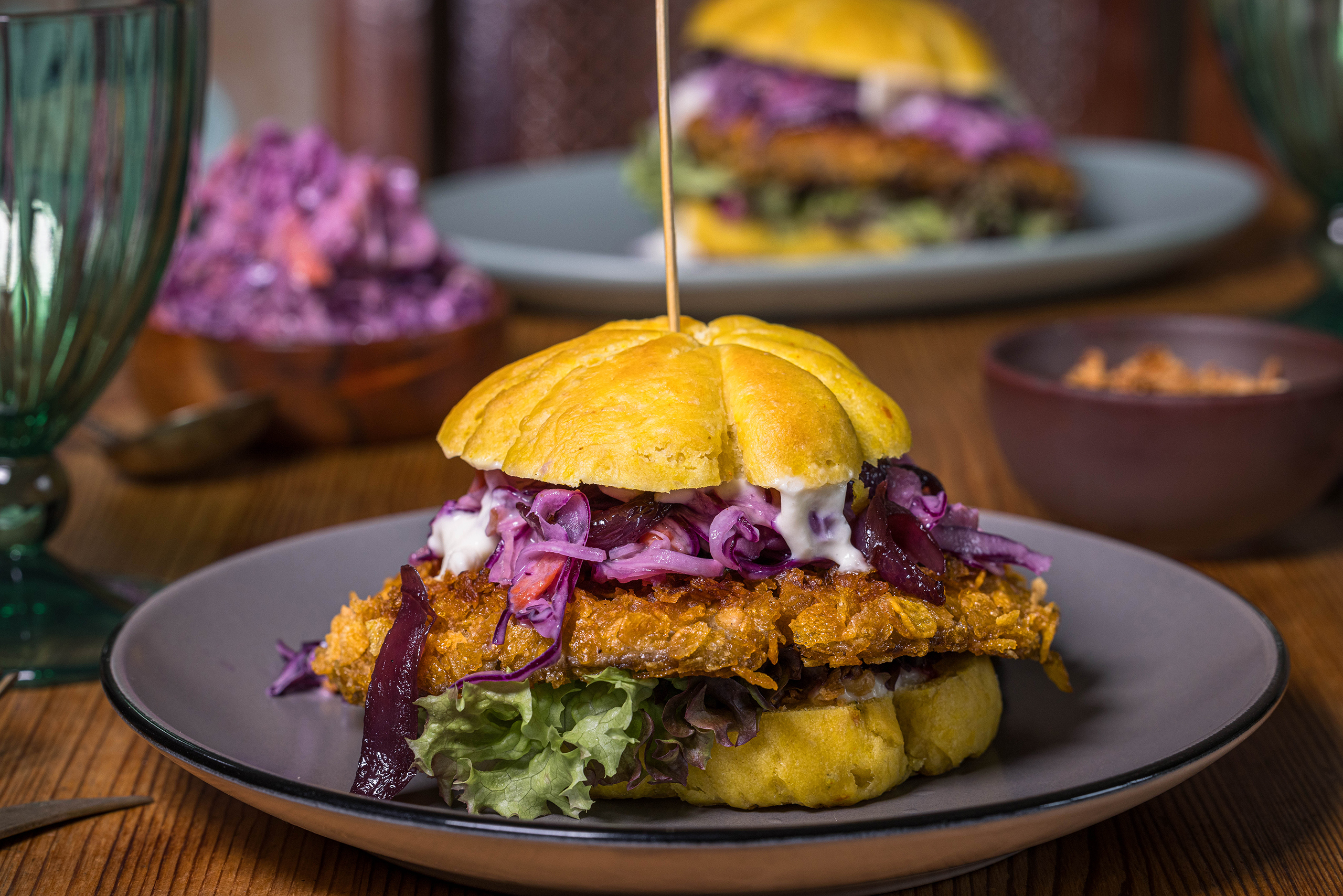 MinutenParasolburger: ein krosser Gaumenschmaus. Ein toller Herbstburger. Parasol in Cornflakespanade. Mit Rotweinzwiebeln, Coleslaw und Kürbisbun.
