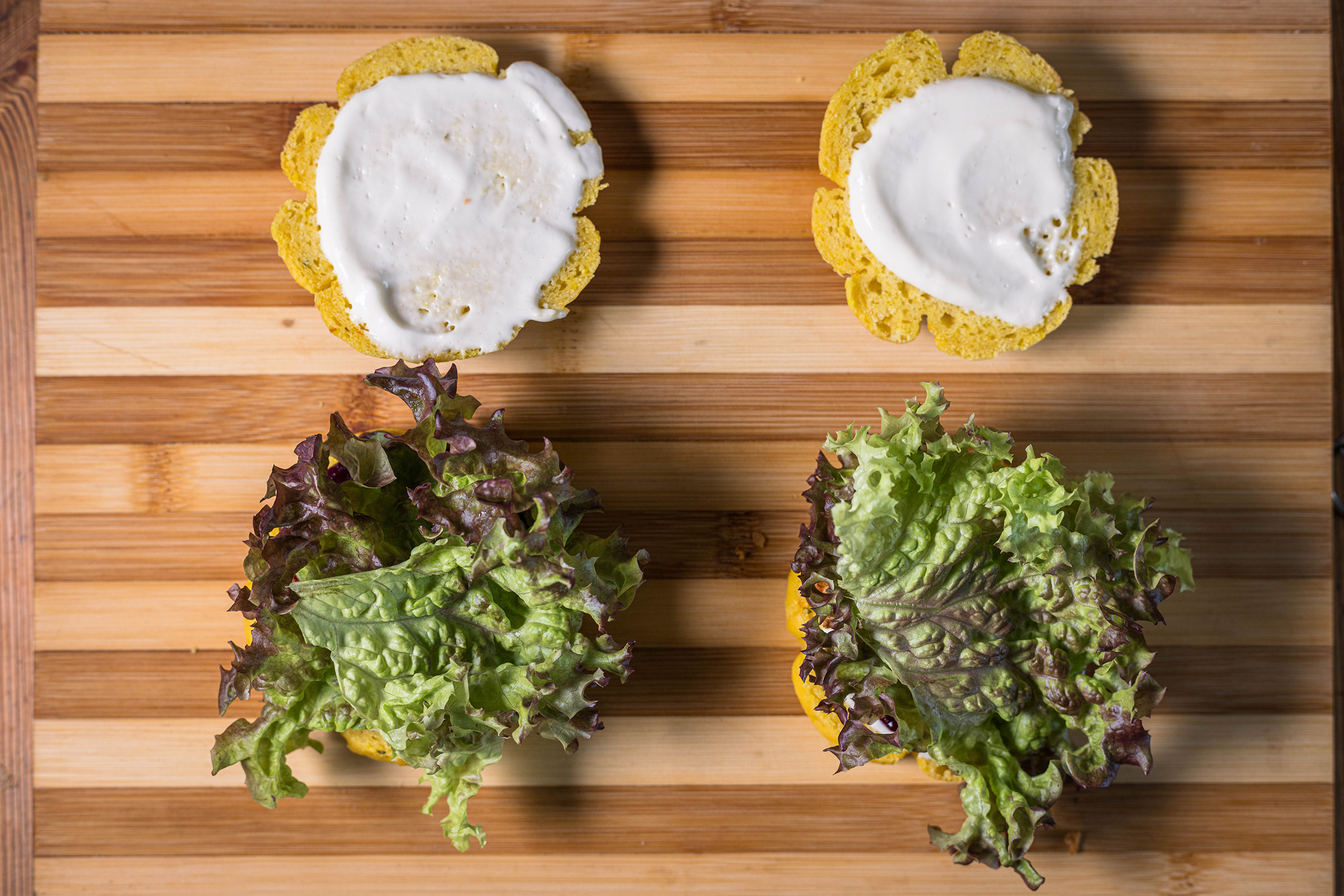 - Beide Brötchenhälften mit Mayonnaise bestreichen.