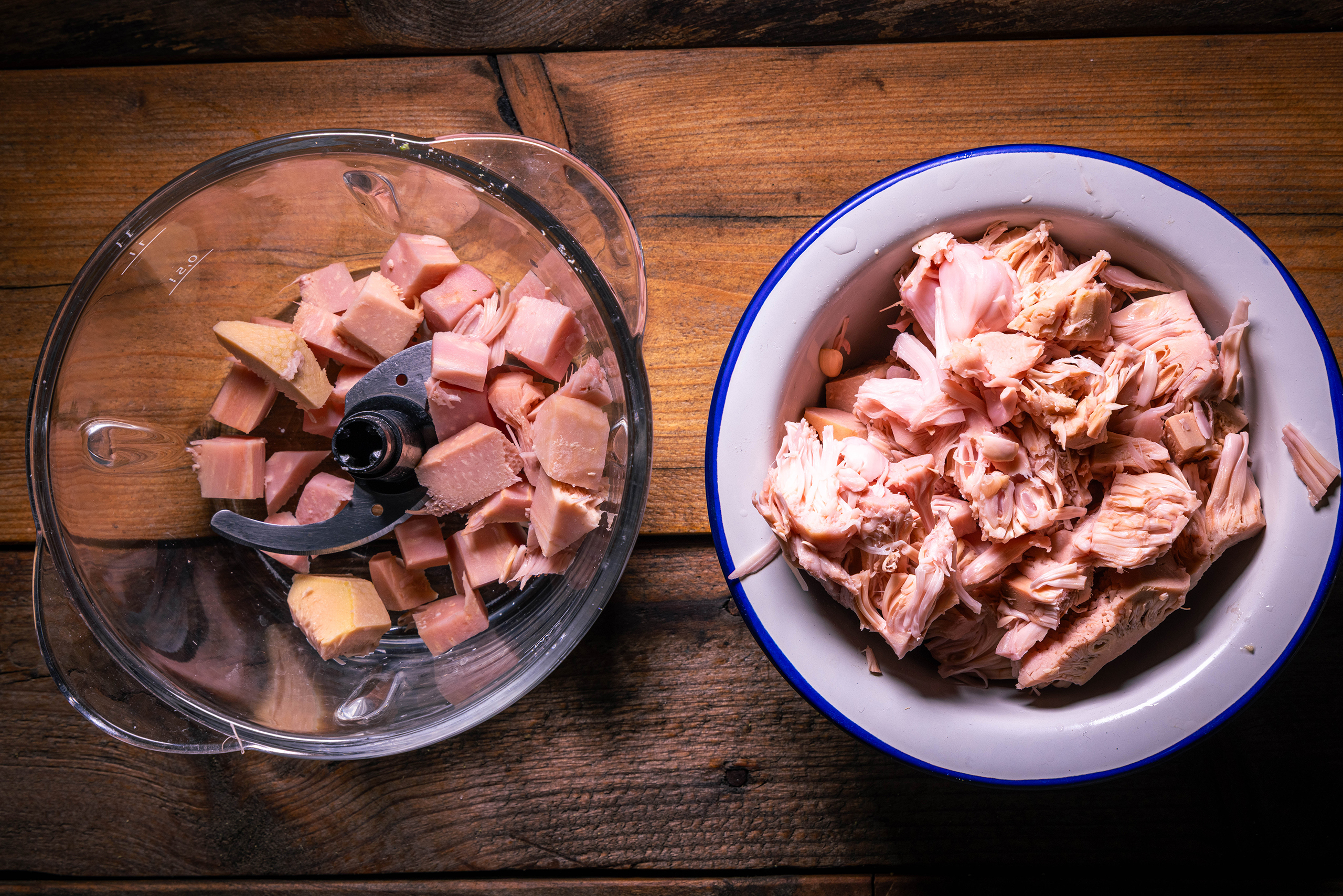 - Die harten Spitzen mit einer Küchenmaschine fein schreddern und zu den abgetrennten Jackfruitfasern geben. Notfalls geht das auch mit einem Messer.