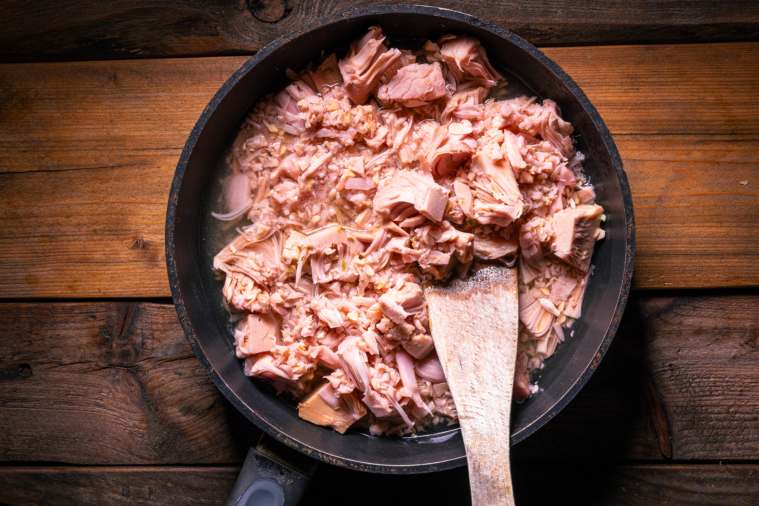 - Die Jackfruitdosen abgießen und von den Jackfruit-Stücken die harten Spitzen abschneiden. Danach die Jackfruit leicht ausdrücken.