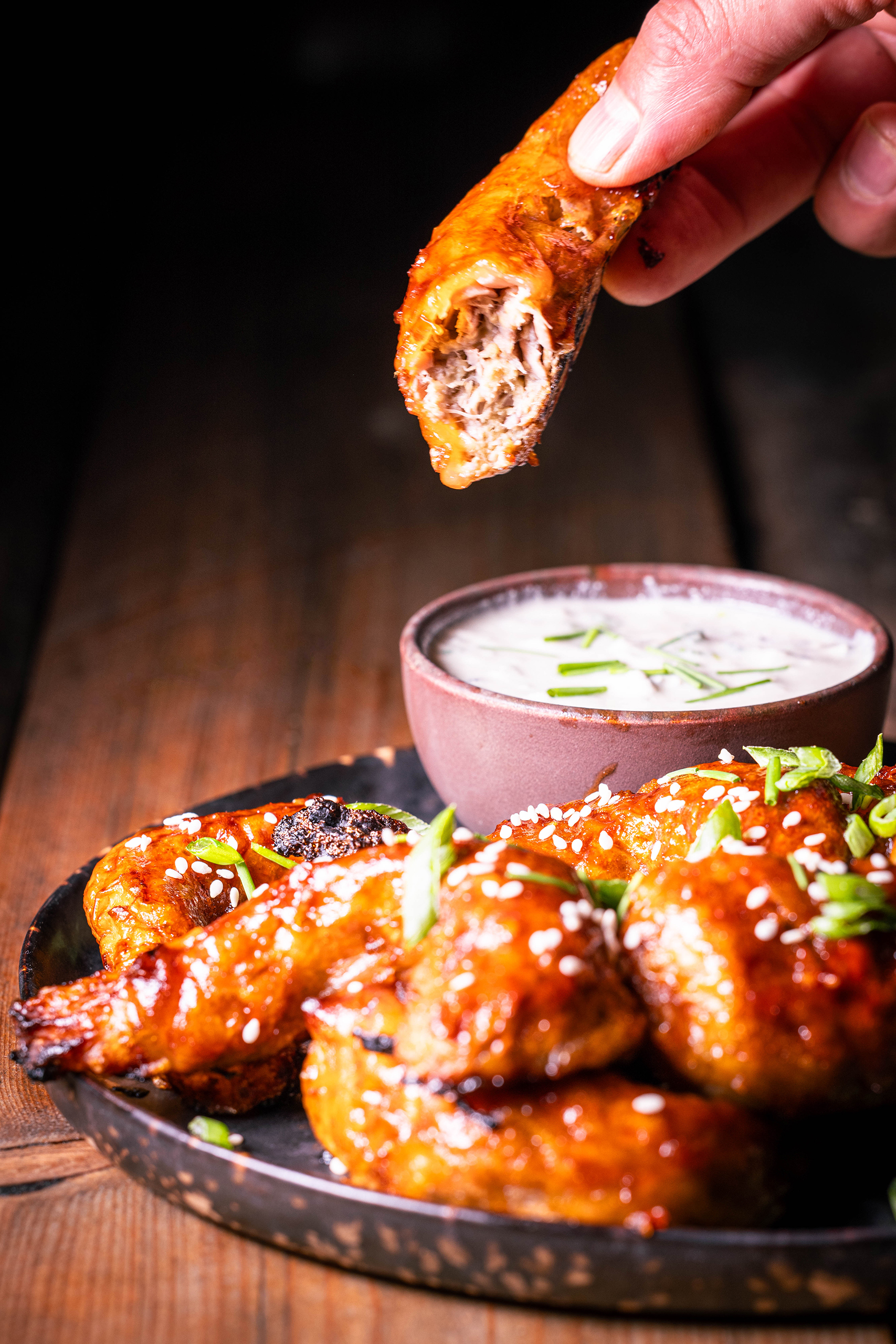 MinutenVegane Sticky Wings – Knusprig, klebrig, unglaublich aromatisch – ein Snack zum Finger abschlecken. Aus Seitan und Jackfruit, mit Haut.