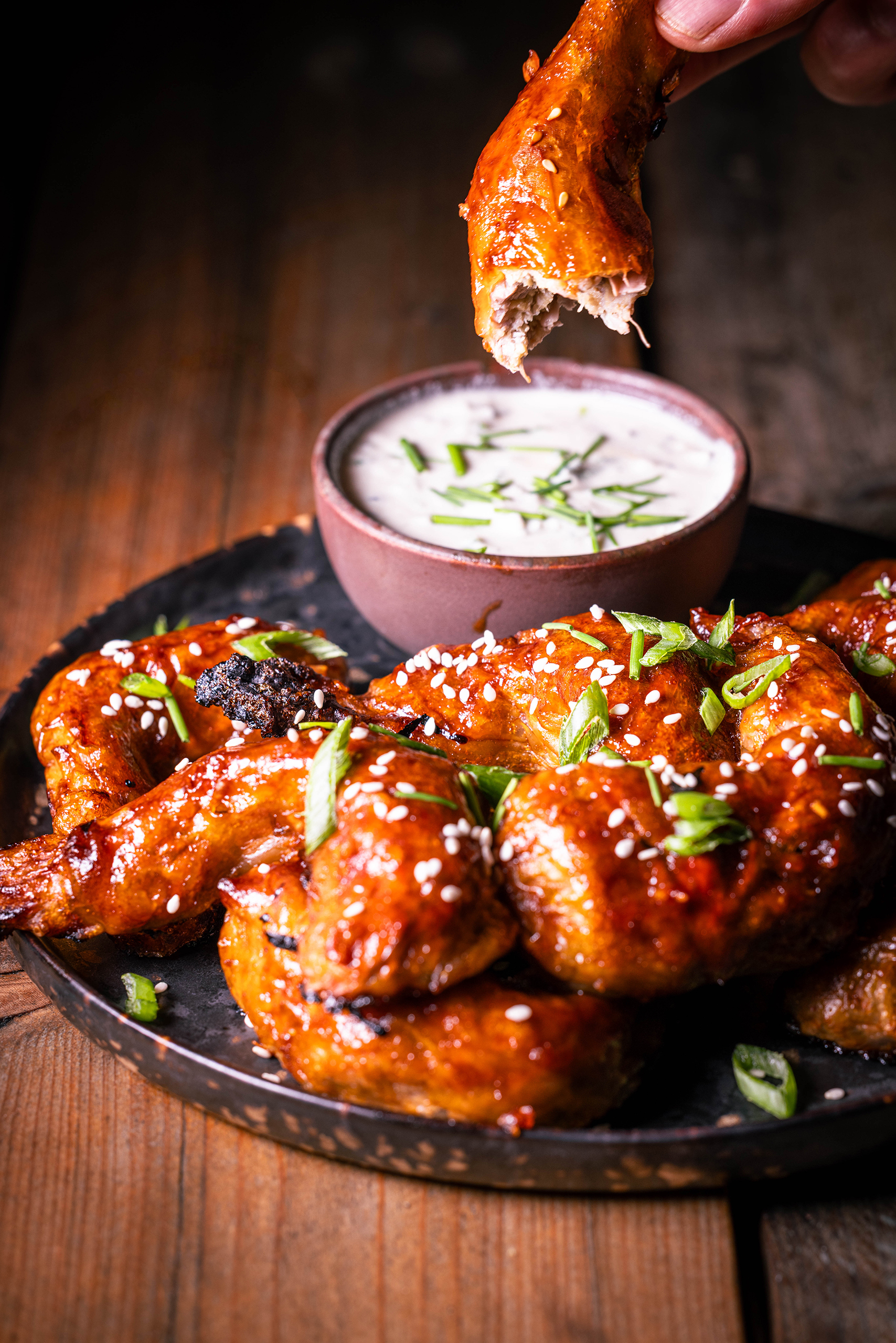 Die zarten veganen Hähnchenflügel werden mit einer unwiderstehlich glänzenden Glasur überzogen: süß, salzig, würzig, voller Umami – mit Noten von veganem Honig, Sojasauce, Knoblauch, Chili und Ingwer.