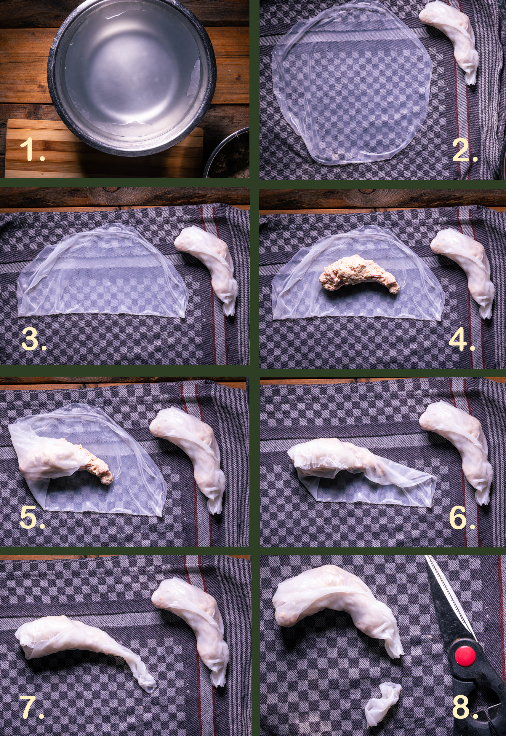 - Ca. 1/16 der Jackfruit-Masse als Hähnchenflügel in die Mitte des Reispapierhalbkreises legen. Die Masse zu einem dünnen Streifen mit Knick formen. Das Reispapier an einem Ende über dem Vleisch einklappen und dann gleichmäßig darum wickeln. Das überstehende Reispapier etwas zusammenzwirbeln und mit einer Schere kürzen. (Einzelne Schritte siehe Fotos.)