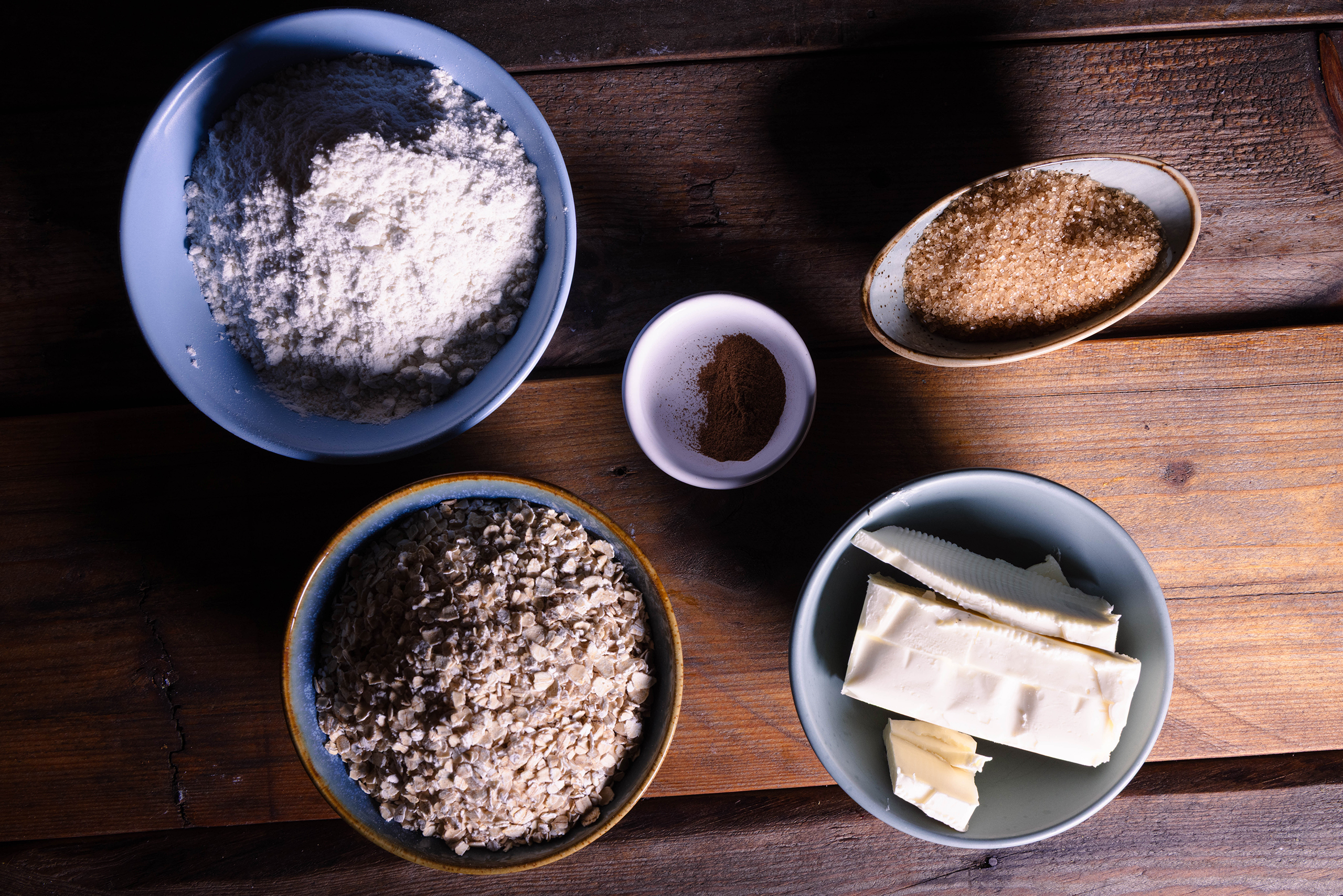 - Für die Streusel, das Mehl mit den Haferflocken und dem Zucker und Zimt vermengen.