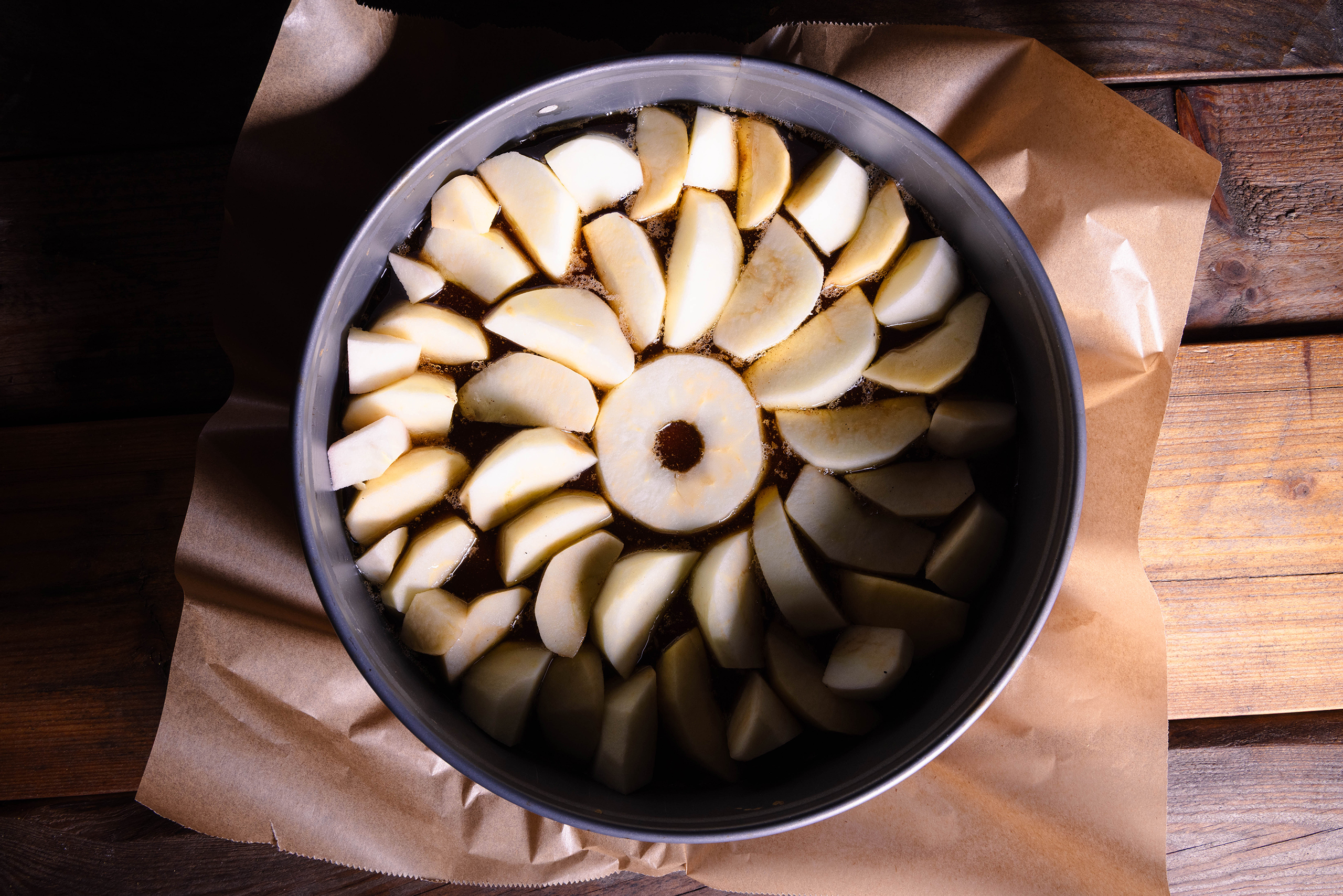 - Die Apfeschnitze gleichmäßig auf der Karamellsauce verteilen.