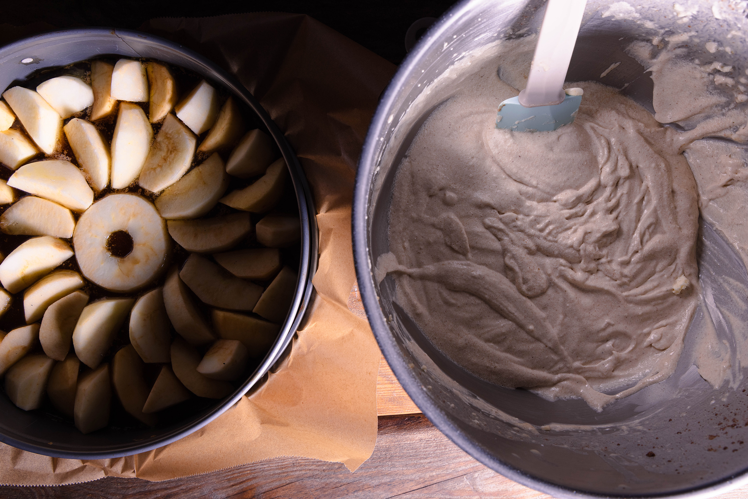 - Den Teig vorsichtig in die Springform auf die Äpfel geben und glatt streichen.