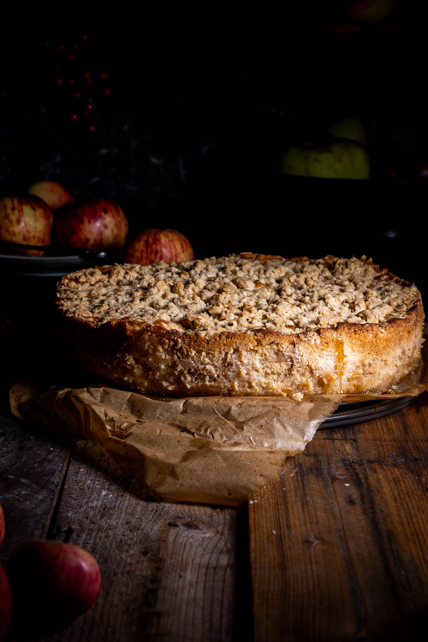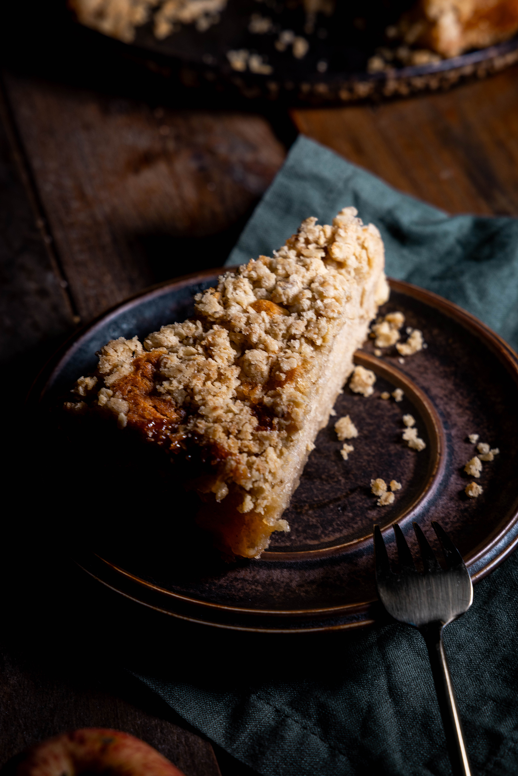 MinutenÜberkopf-Apfelkuchen – saftiger Apfel in buttrigem Cider-Karamell, bedeckt von zart-luftigem Teig, mit Zimt und Cider. Darauf Haferstreusel.