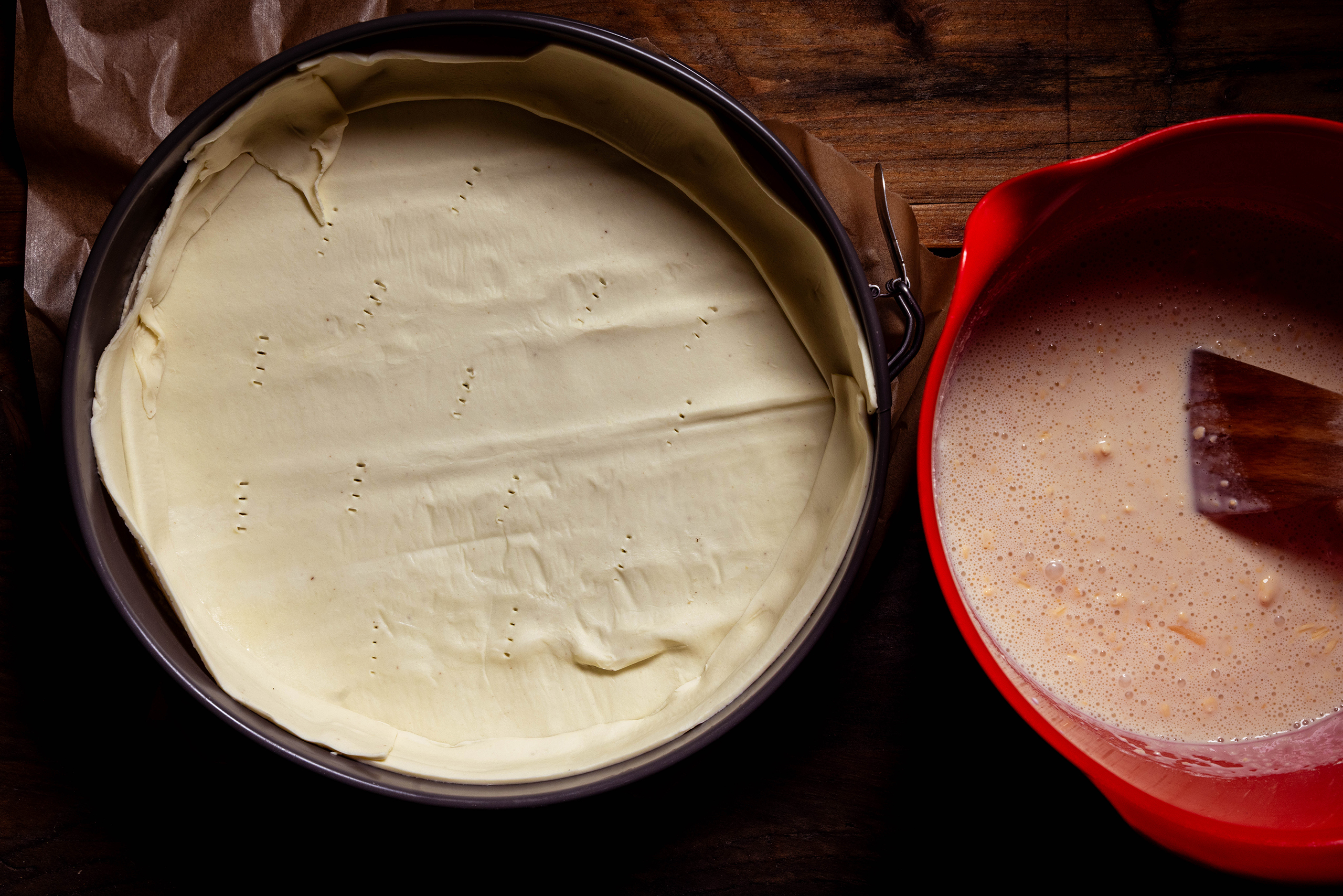 - Eine Springform mit Backpapier auslegen und mit dem Blätterteig auskleiden. Der Rand sollte dabei 3-4 Zentimeter hoch werden. Den Boden regelmäßig mit einer Gabel einstechen.