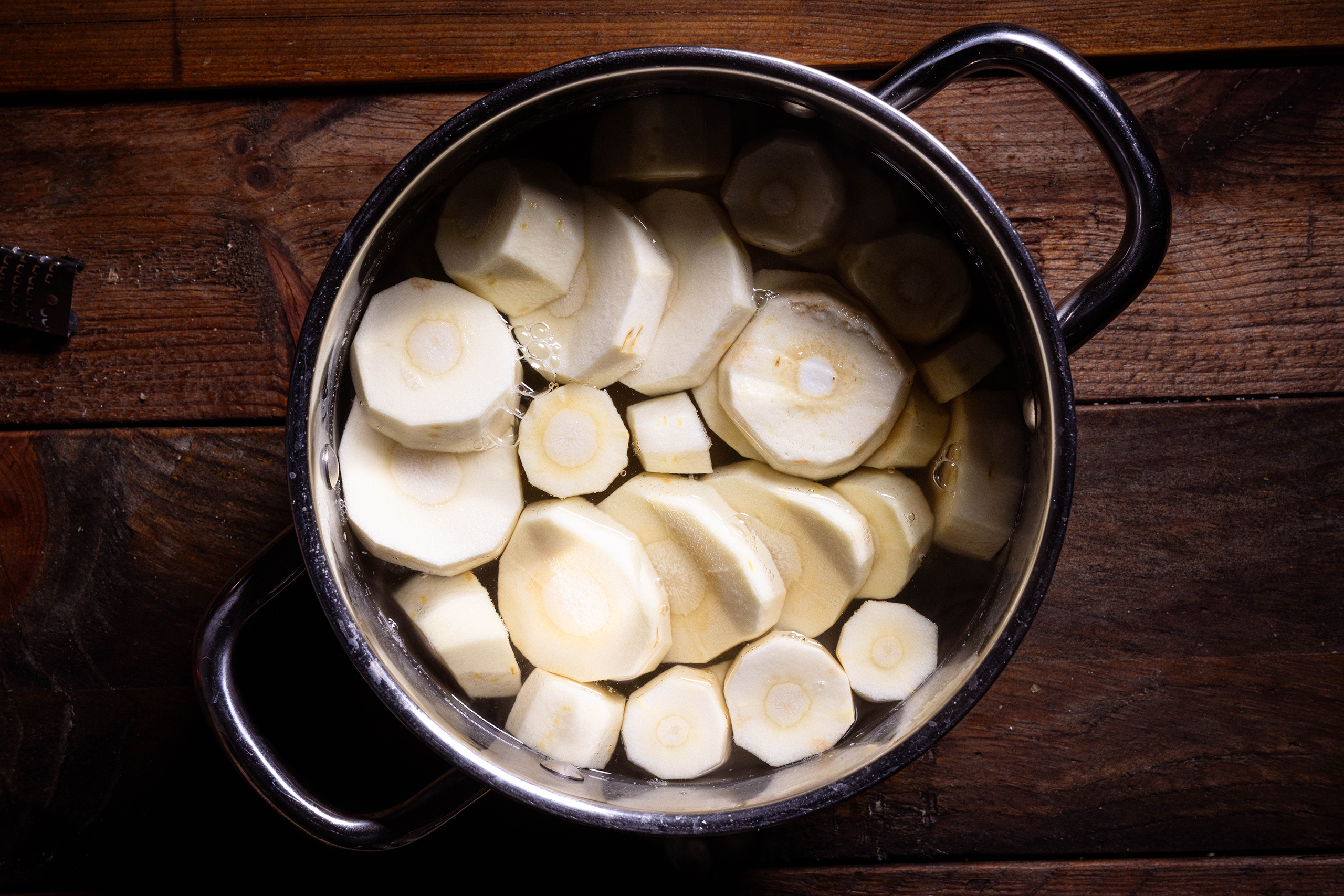 - Kartoffeln und Pastinaken hinein geben und 20 Minuten kochen lassen. Dann abgießen.