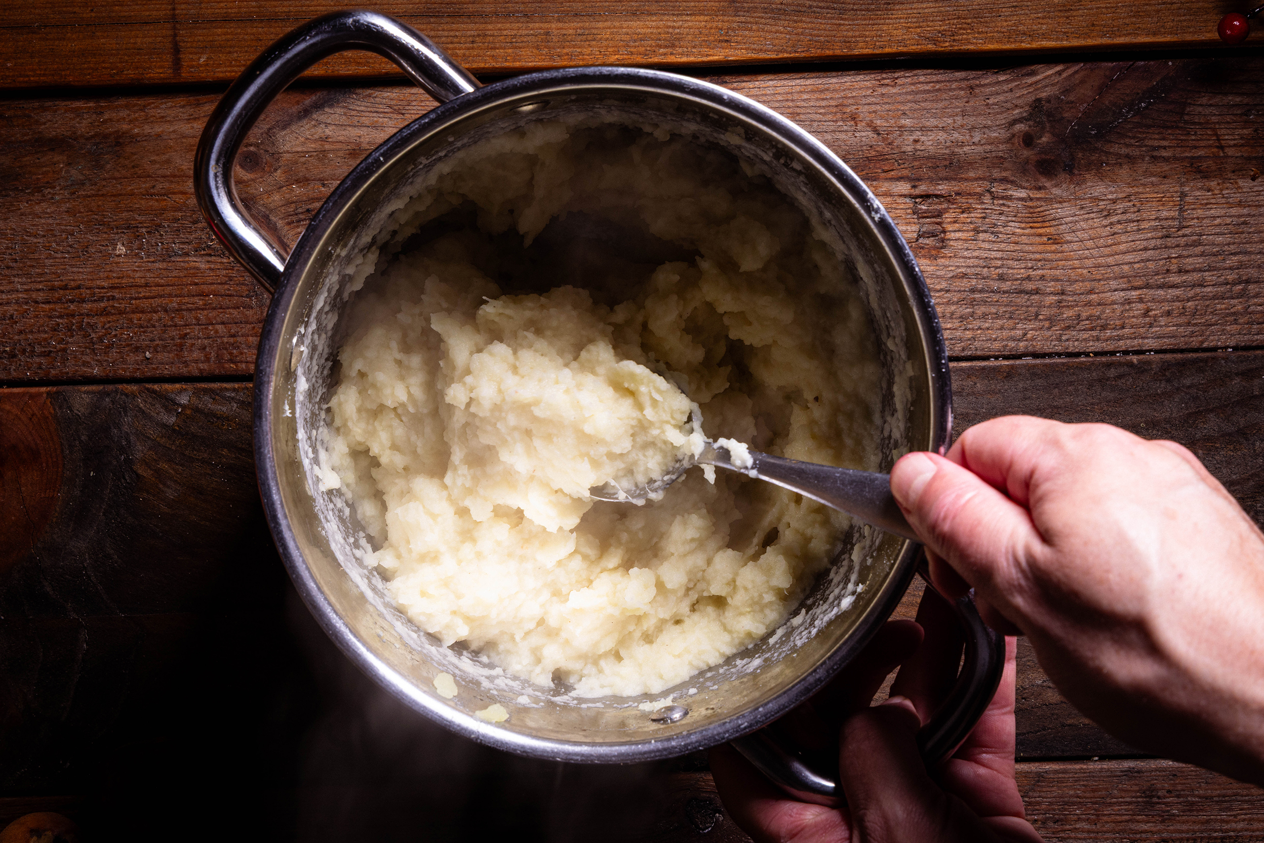 - Noch kochend heiß mit einem Kartoffelstampfer zu Brei zerstampfen.