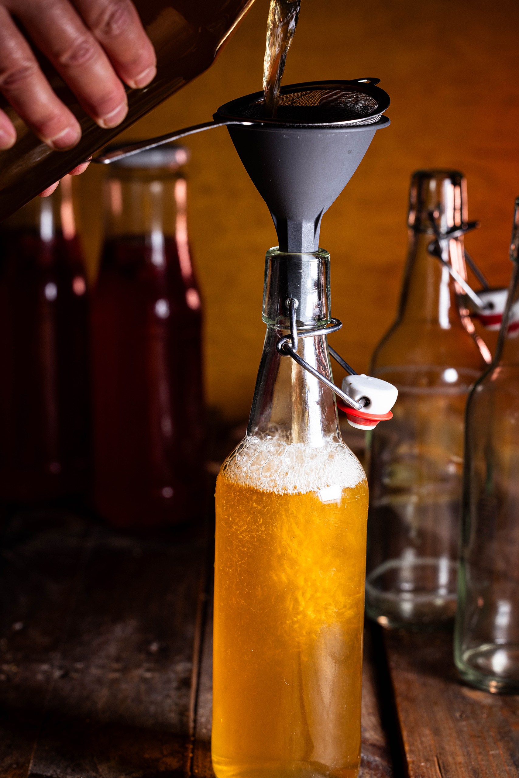 - Abseihen, in eine Flasche abfüllen und im Kühlschrank lagern. Dort hält der Kombucha nach der Zweitfermentation wochenlang.