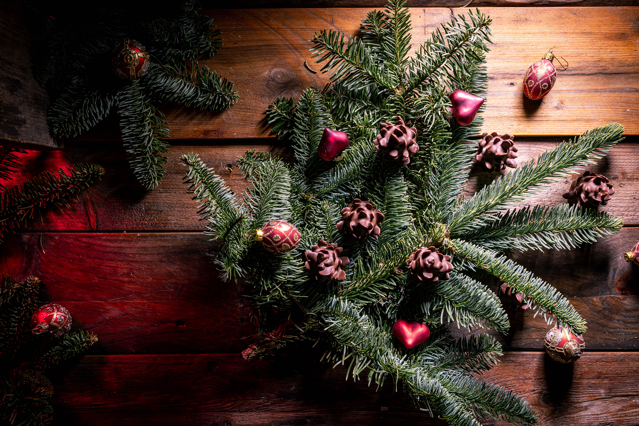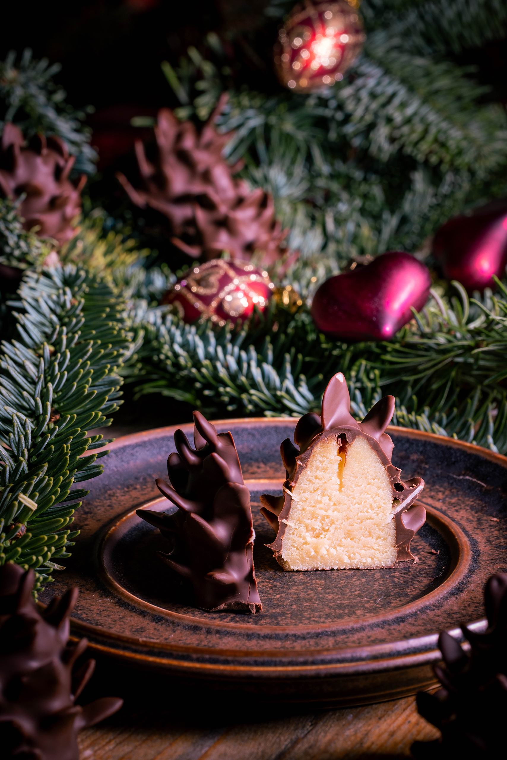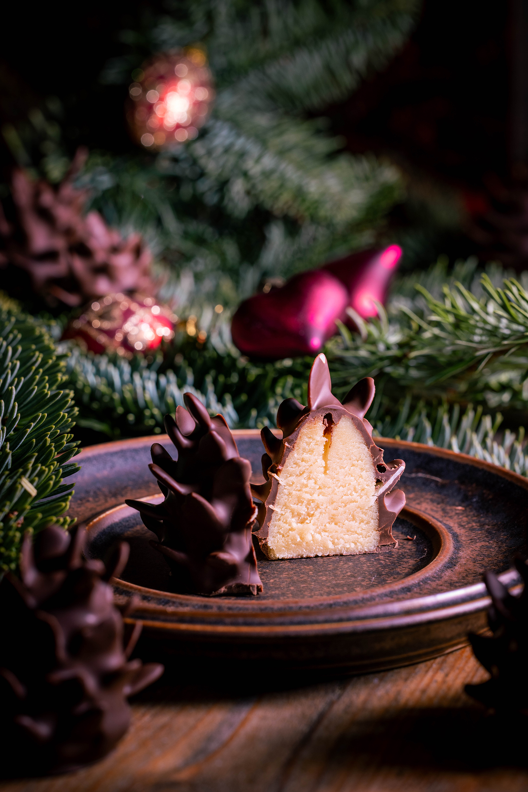 Schokozapfen - Marzipan-Tannenzapfen - dekorativ mit Weihnachtsbaumschmuck in Tannenzweigen platziert.