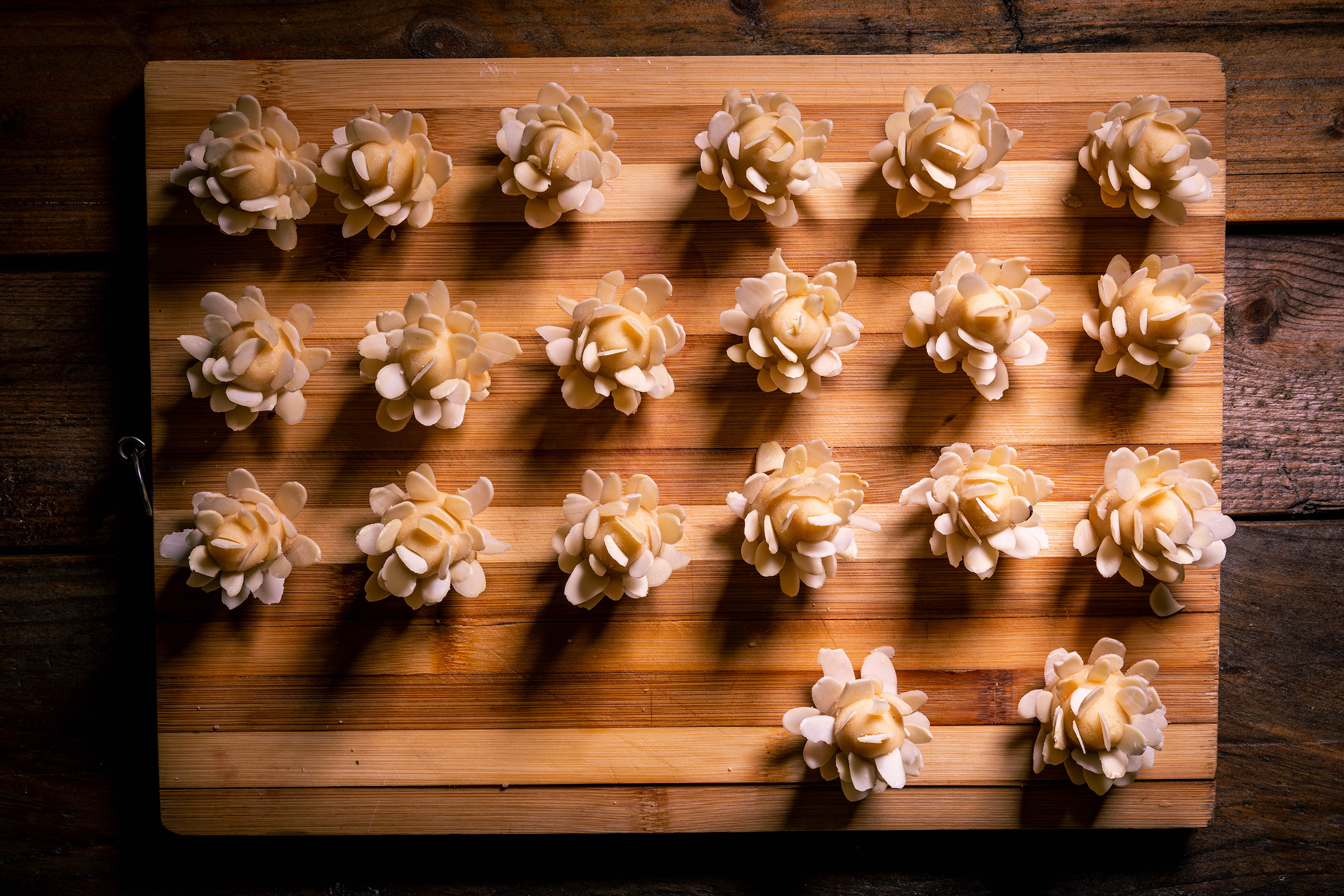 20 Marzipanzapfen, gespickt mit Mandelhobeln.