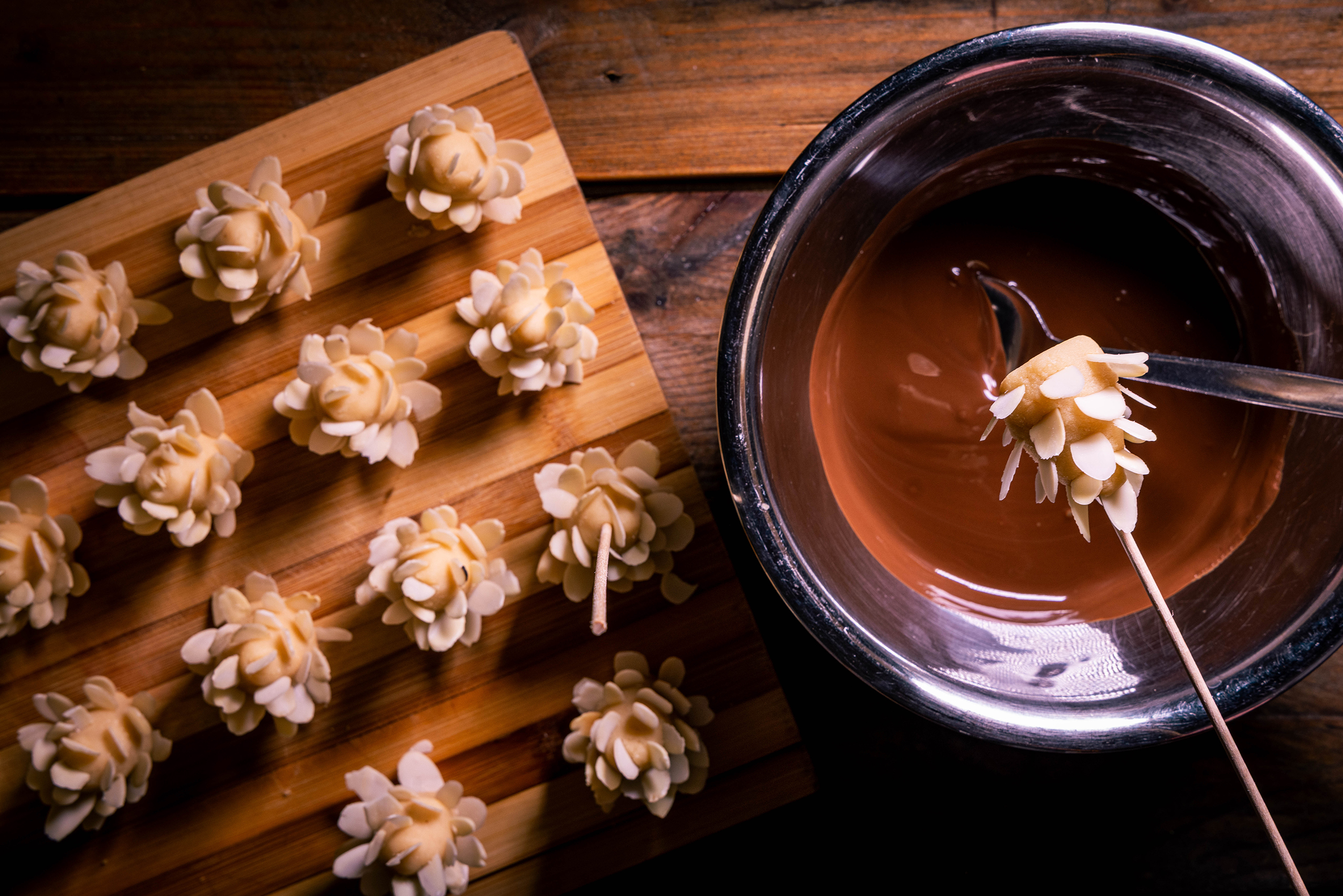 3. Die fertig mit Mandelhobeln verzierten Marzipanzapfen können jetzt mit Schokolade glasiert werden.