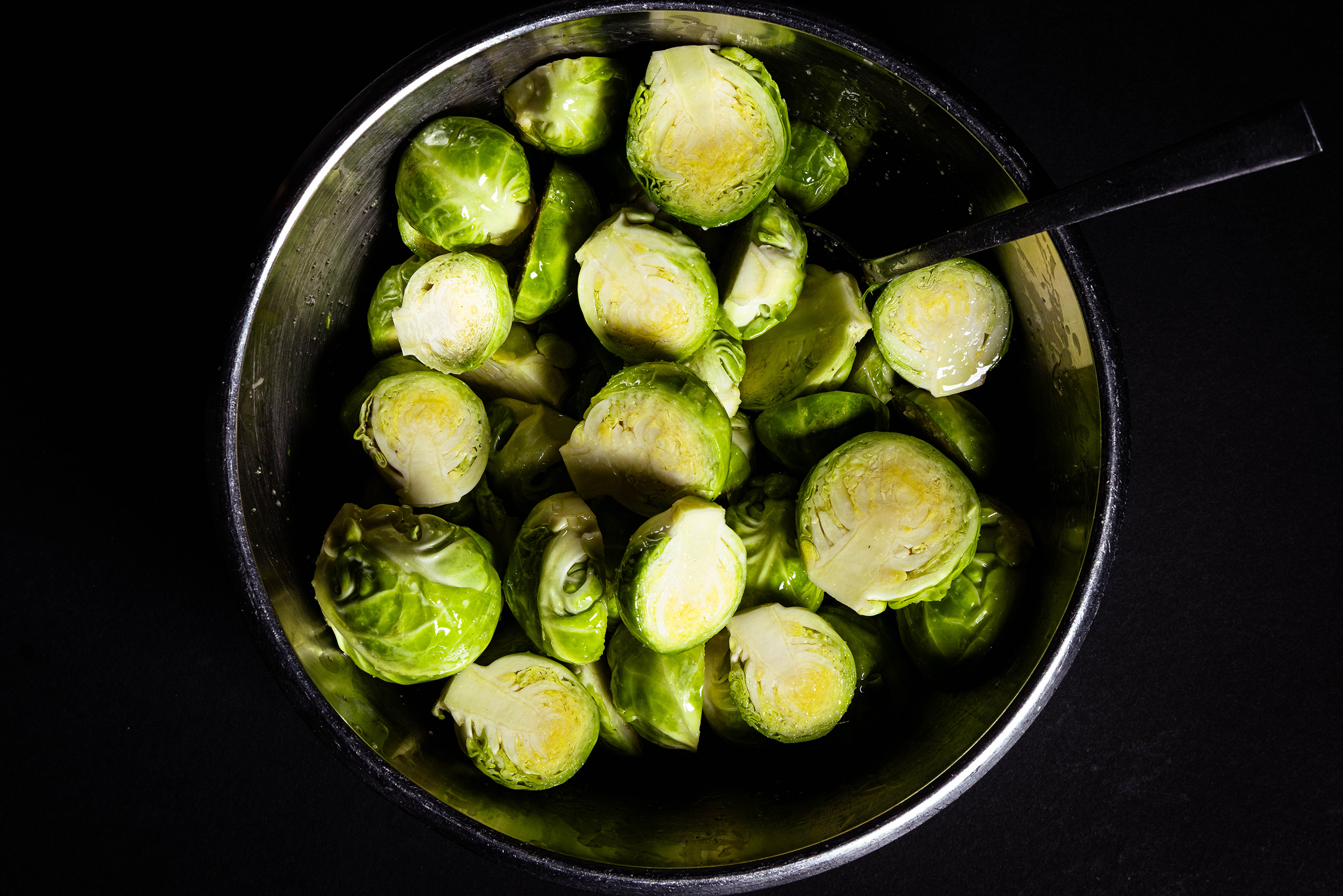 • Die halbierten Rosenkohlköpfe mit dem Olivenöl und 1,5 TL Salz in einer Schüssel vermengen.