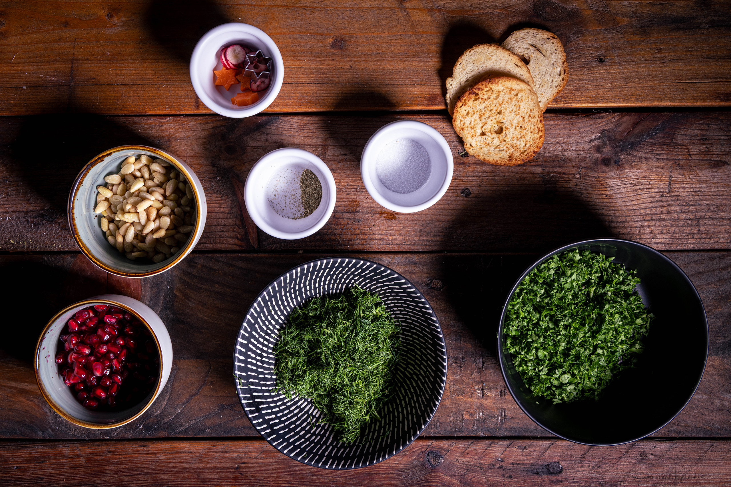 Meinen cremigen, veganen Frischkäse stelle ich in diesem Rezept aus Cashewkernen her, gesund und gehaltvoll. Mit fermentiertem Knoblauch (alternativ frischem), Hefeflocken und Brottrunk bringe ich den käsigen Geschmack an die Creme, voller Tiefe und Umami. Perfekt um in einem aromatischen Mantel aus frischen Kräutern, fruchtigem Granatapfel und knusprigen Pinienkernen serviert zu werden.