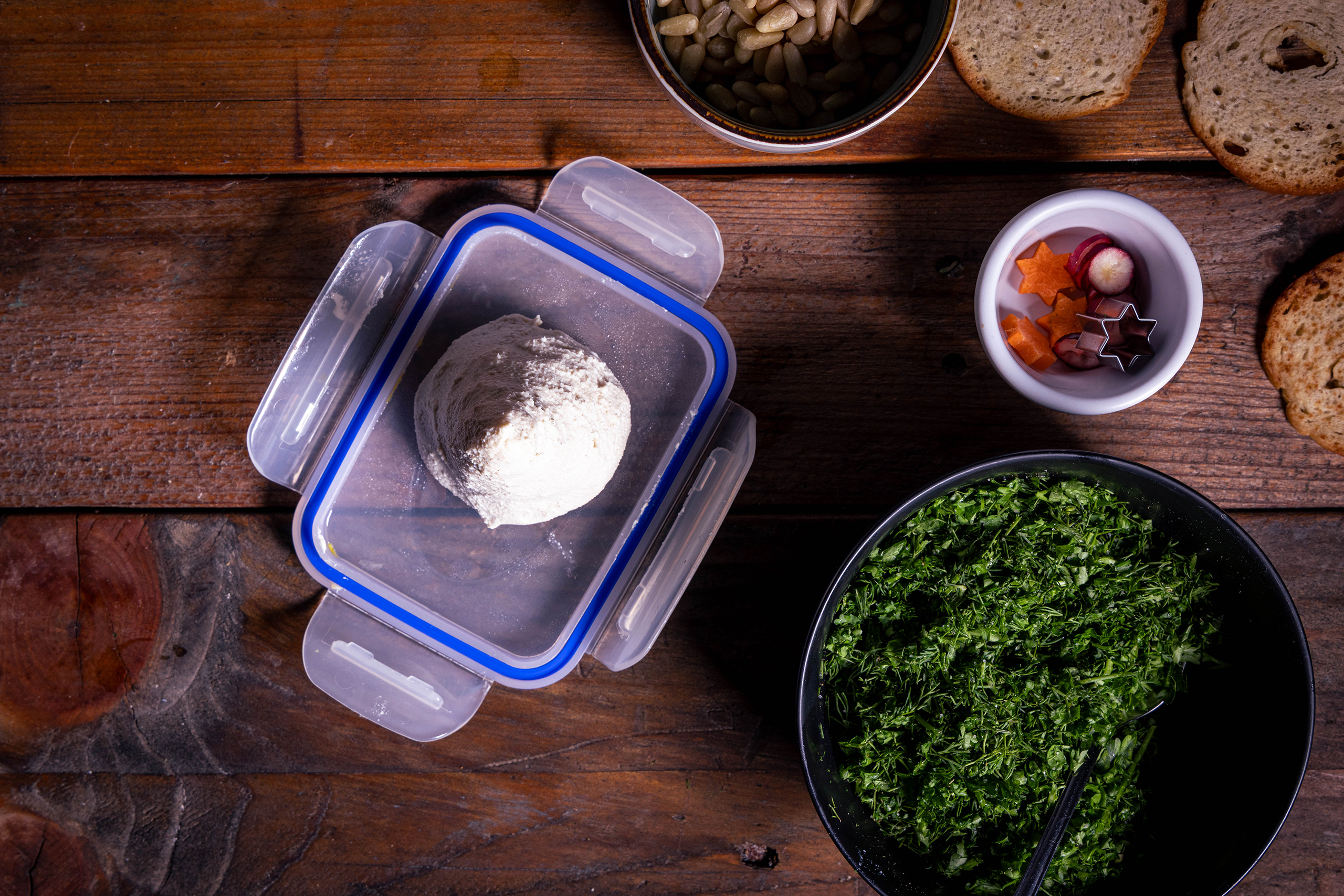 • Die rein pflanzliche Käsemasse in einer Plastikdose verschlossen für mindestens eine Stunde im Kühlschrank kalt stellen. Dort kann man sie aber auch mehrere Stunden oder über Nacht aufbewahren, bevor man sie weiter verarbeitet.
