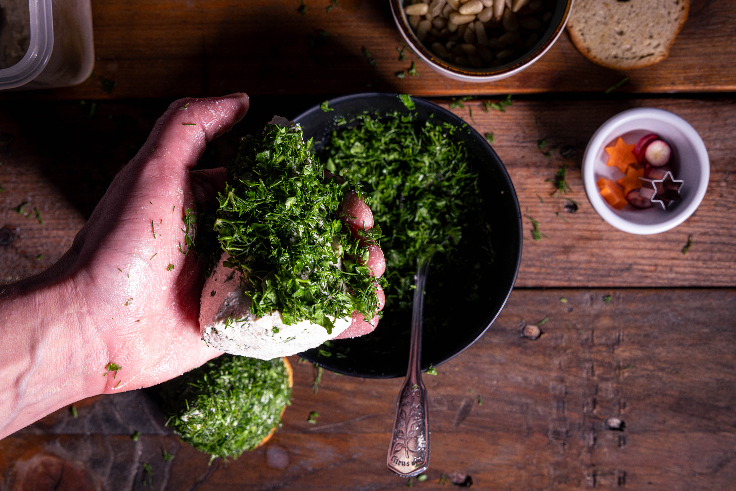 • Gehackten Dill, Petersilie, Schabziger Klee und Salz vermengen.