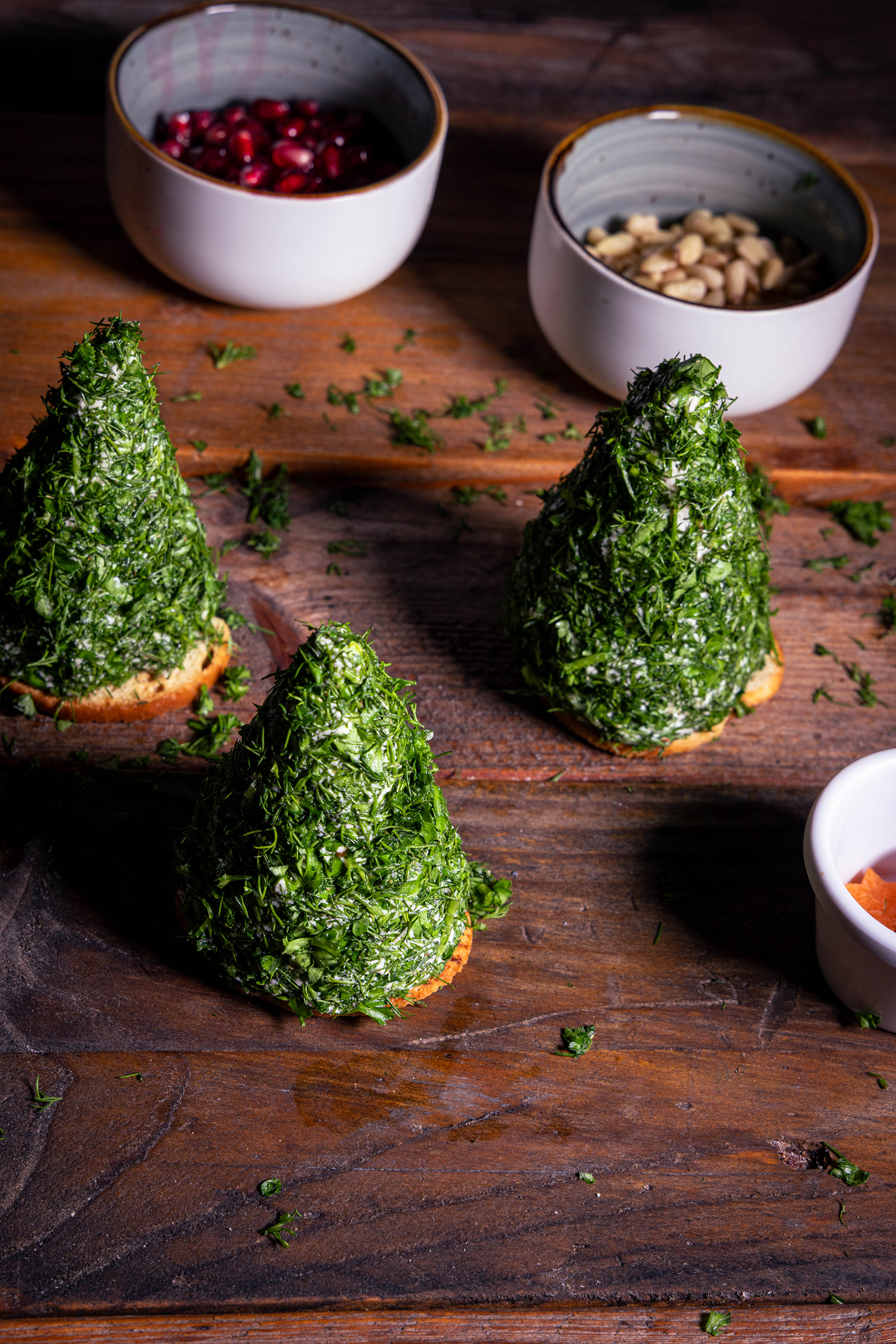 Ob für ein festliches Buffet, das Weihnachtsfrühstück oder einen feierlichen Snack zwischendurch, empfehle ich meine Vrischkäse-Weihnachtsbäumchen. Aus selbstgemachtem, veganen Frischkäse. Geschmackvoll garniert mit frischem Kräutern, Pinienkernen und Granatapfelkernen. Da werden die Augen am Tisch ganz groß!
