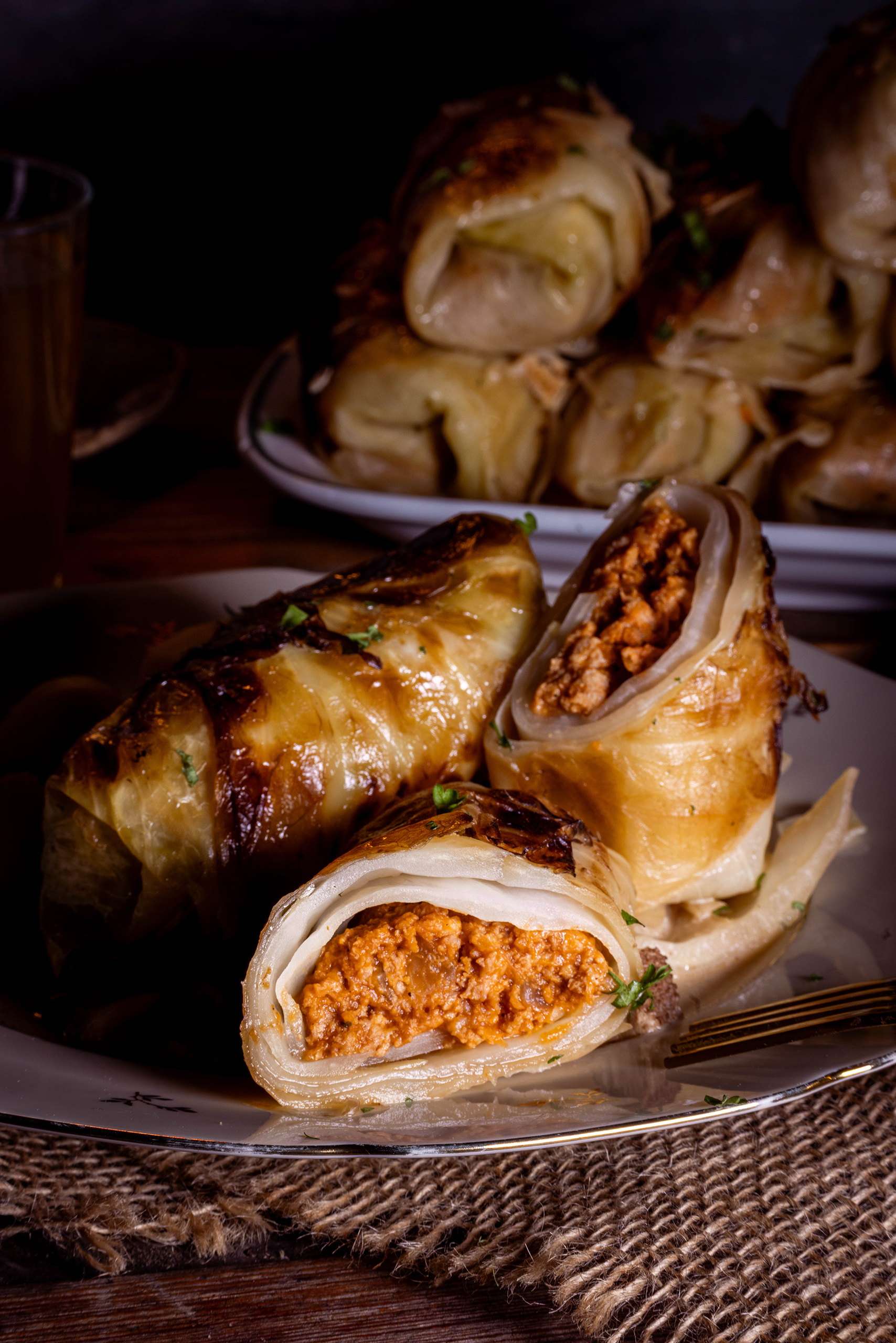 Eine knusprige Teighülle, gewürzt mit grob gemahlenem Cumin. Darin verborgen eine cremige, aromatische Füllung mit Wirsingkohl und Pilzen.