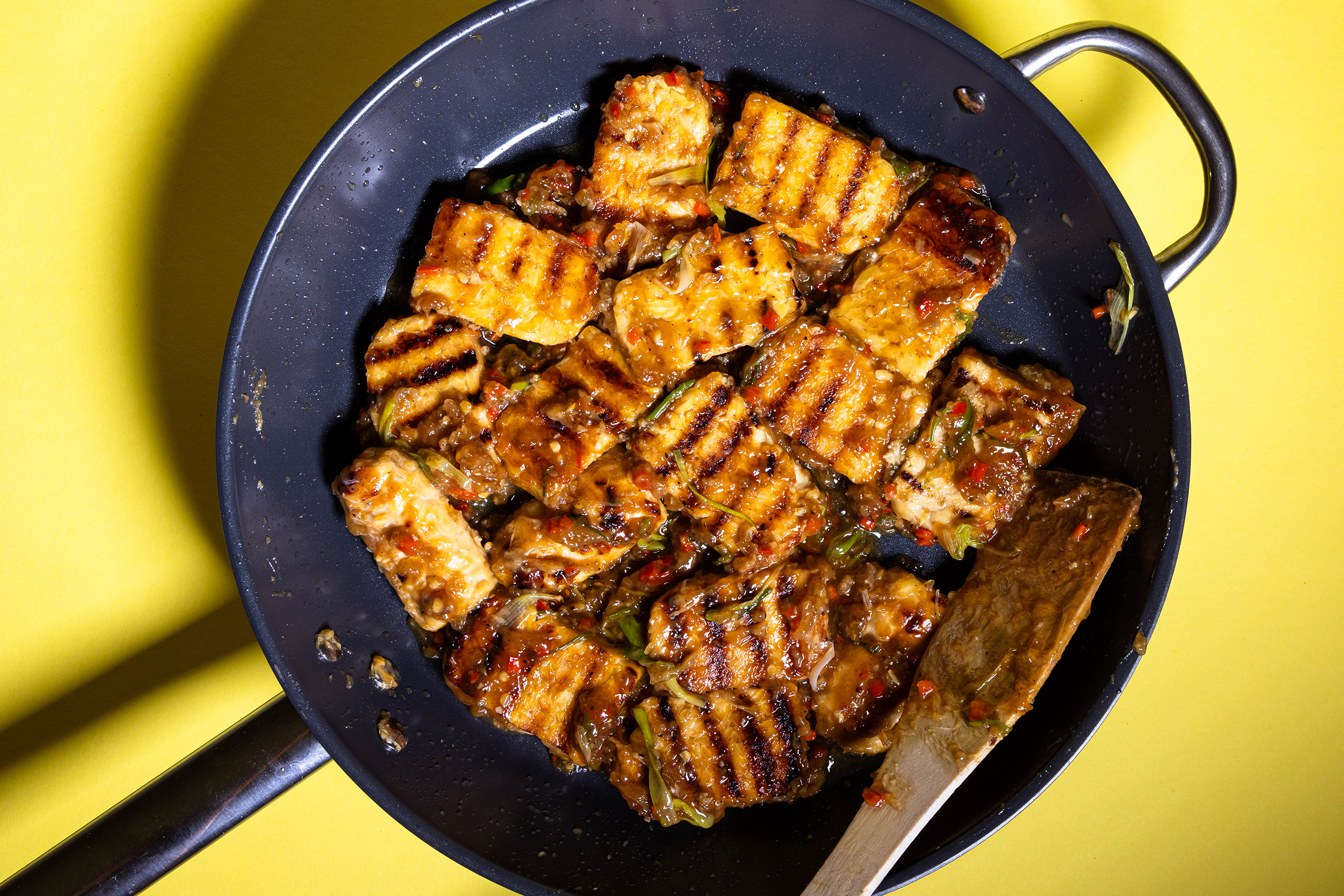 Ein wahrer Gaumenschmaus: Tempeh in einer Grillpfanne zubereiten, dann mit Ahornsirup glasieren und erneut grillen, um ihn dann anschließend in einer würzigen Chilisauce zu braten.
