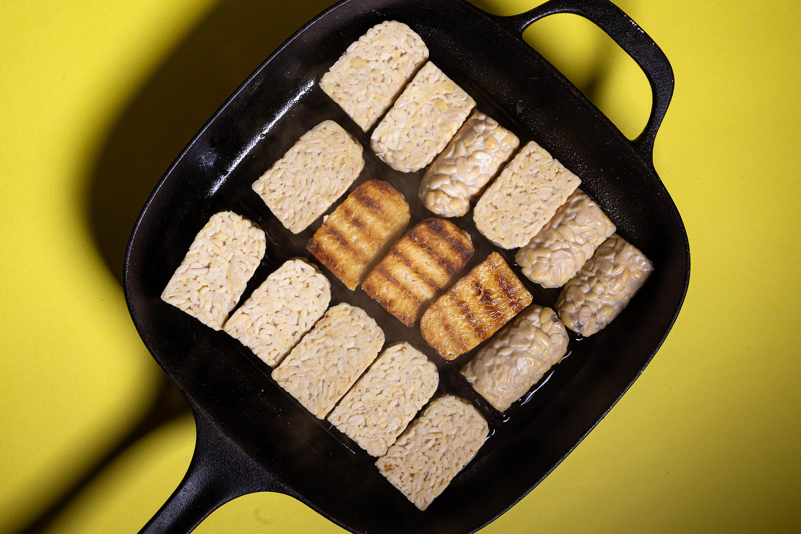- Etwas Öl in einer Grillpfanne erhitzen und den Tempeh beidseitig anbraten.