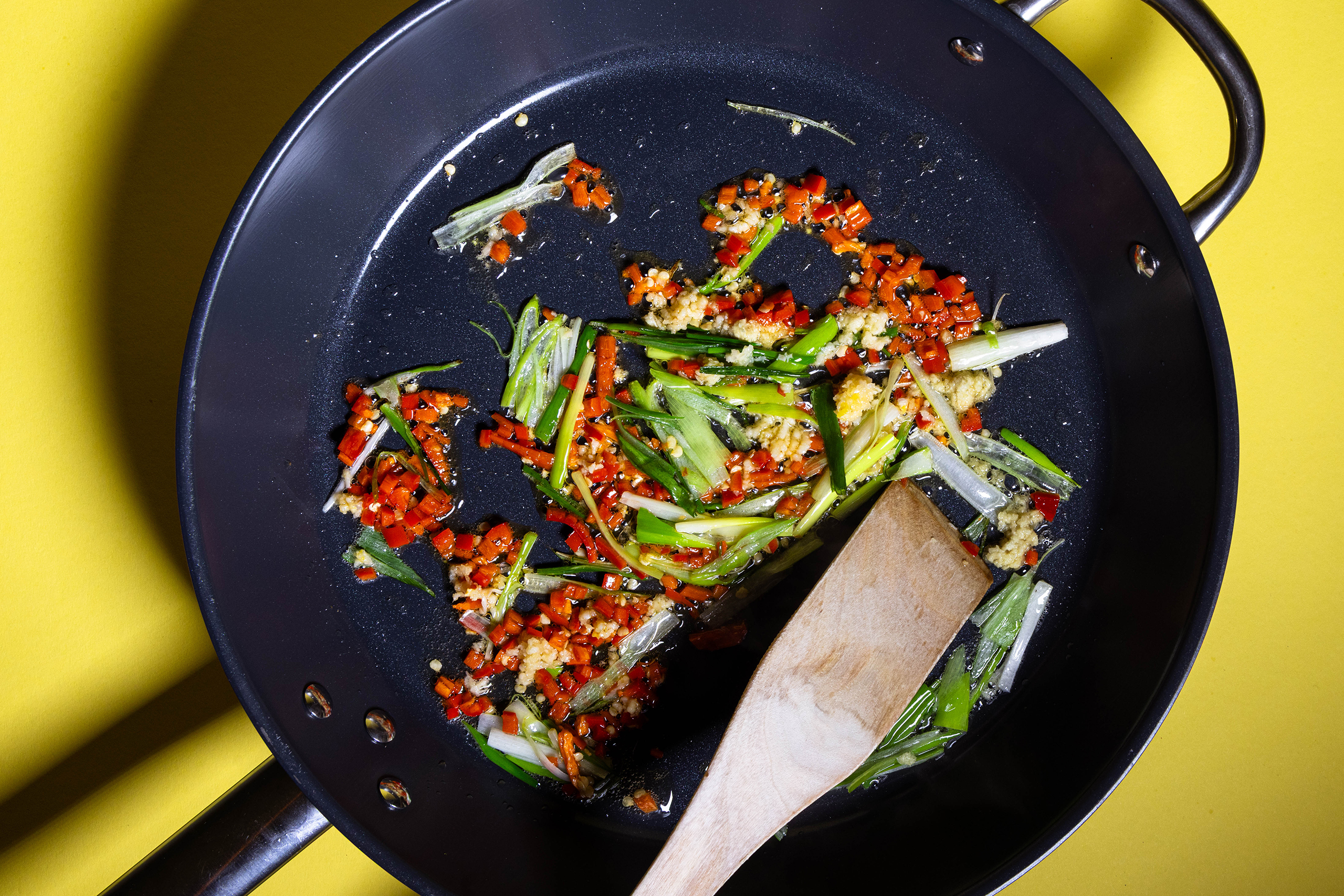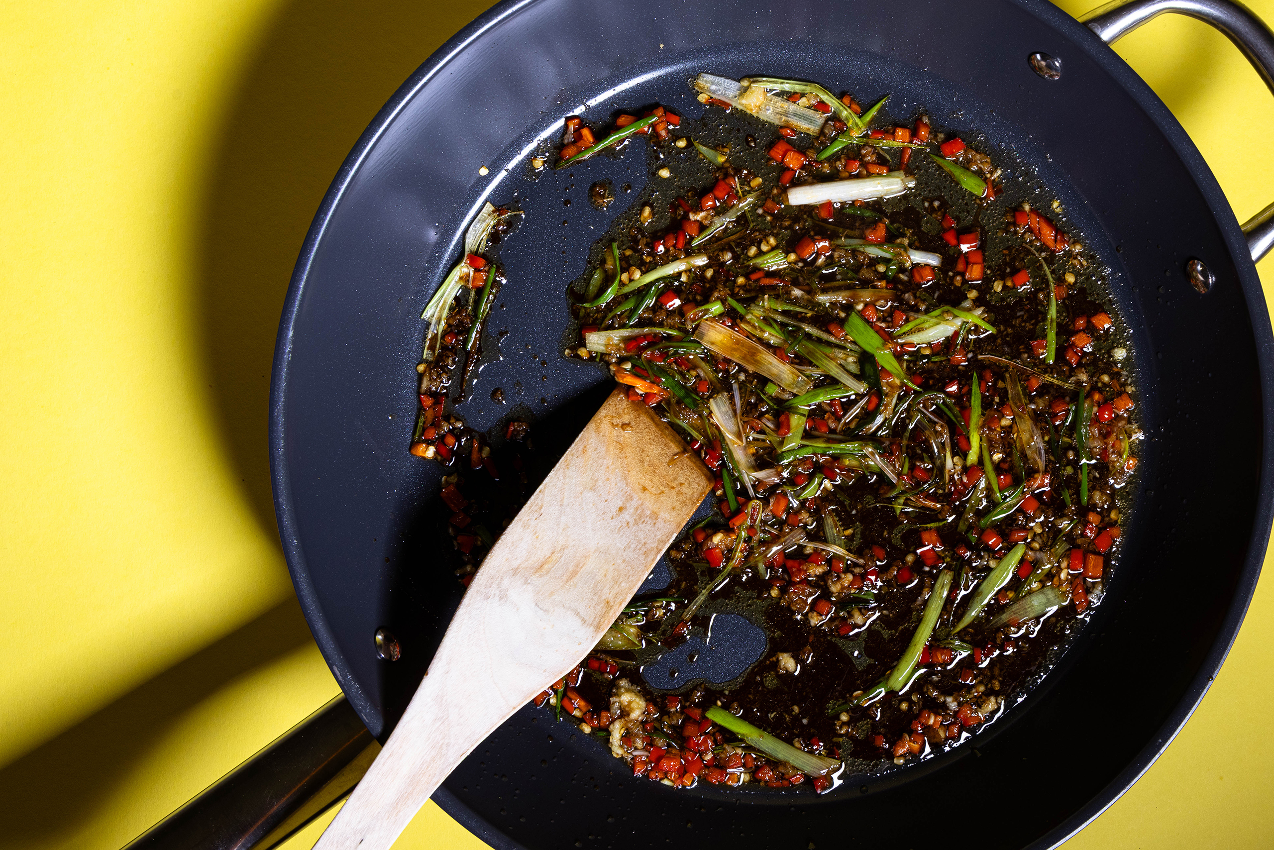 - Eine normale Pfanne mit etwas Öl erhitzen und die Lauchzwiebeln darin braten, dann auch die gepressten Knoblauchzehen, Chili und den Ingwer darin anbraten. Sojasauce, Reisessig, Limettensaft und den Rest des Ahornsirups einrühren, danach auch die aufgelöste Stärke und den Pfeffer einrühren.