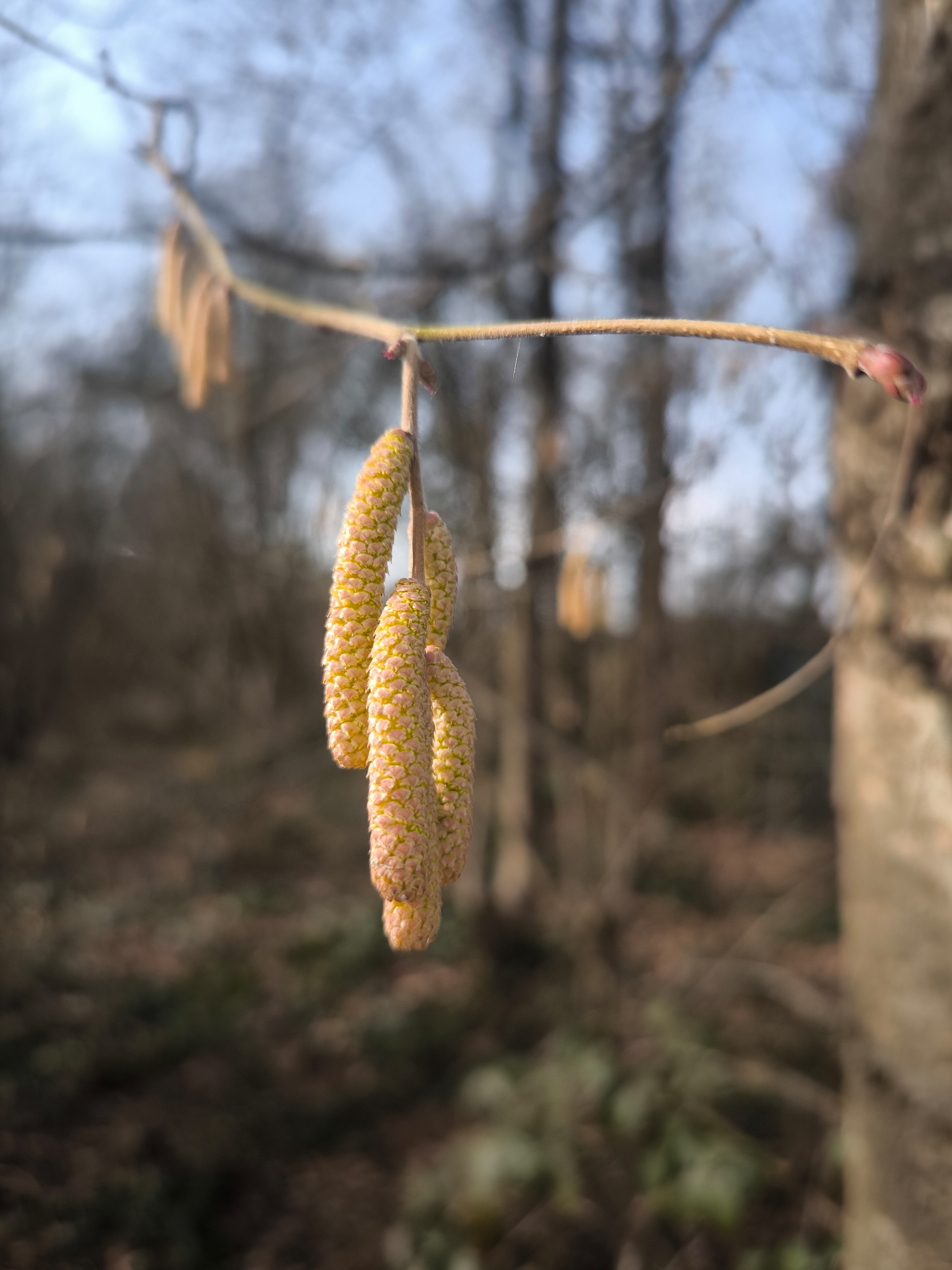 Im Januar oder Februar, je nach Witterung, blühen die Haselkätzchen. Das sind die Blüten der Haselnusssträucher.