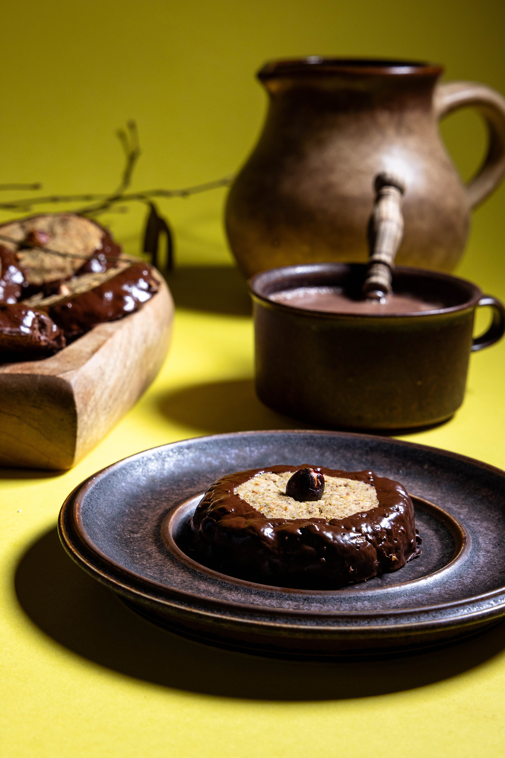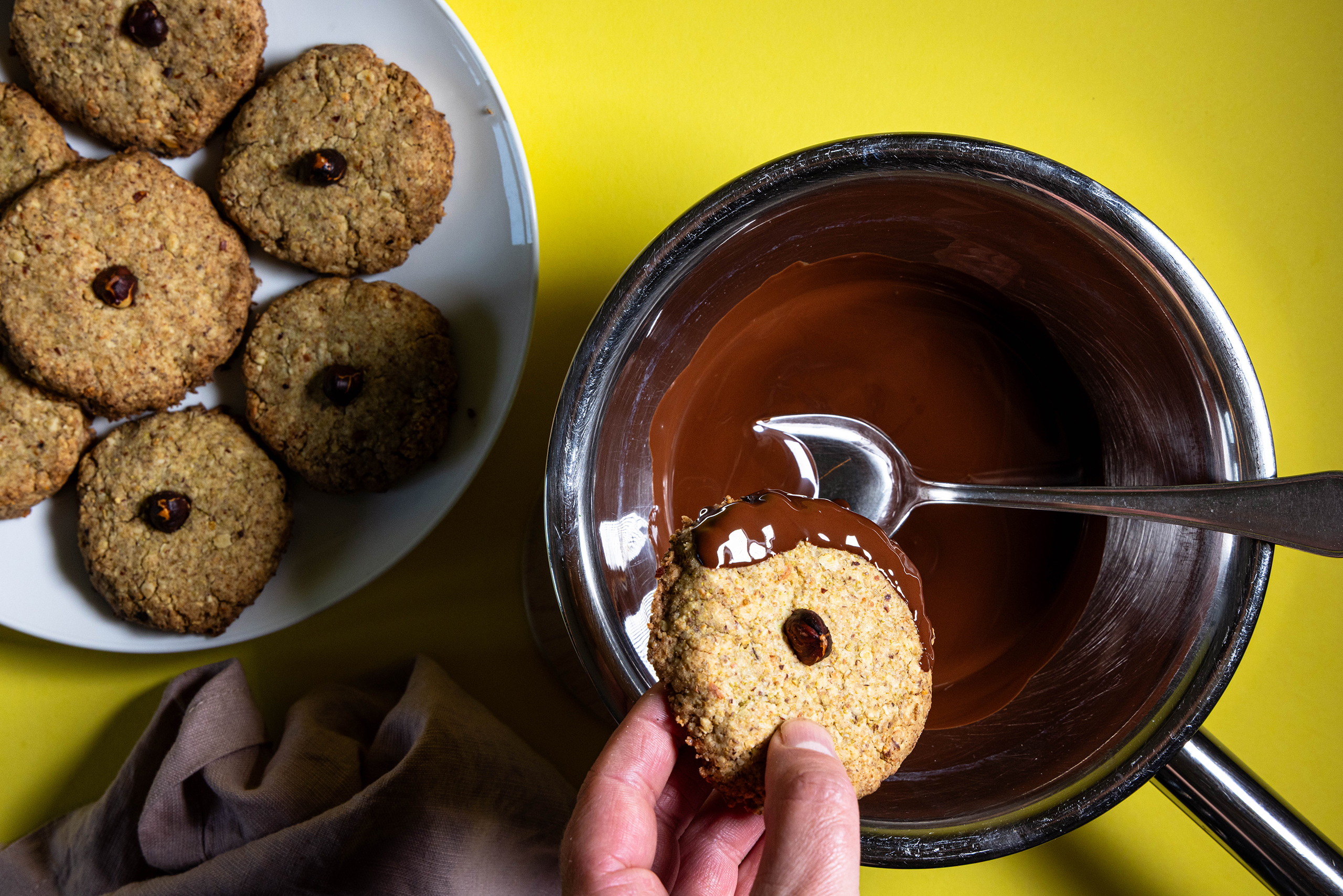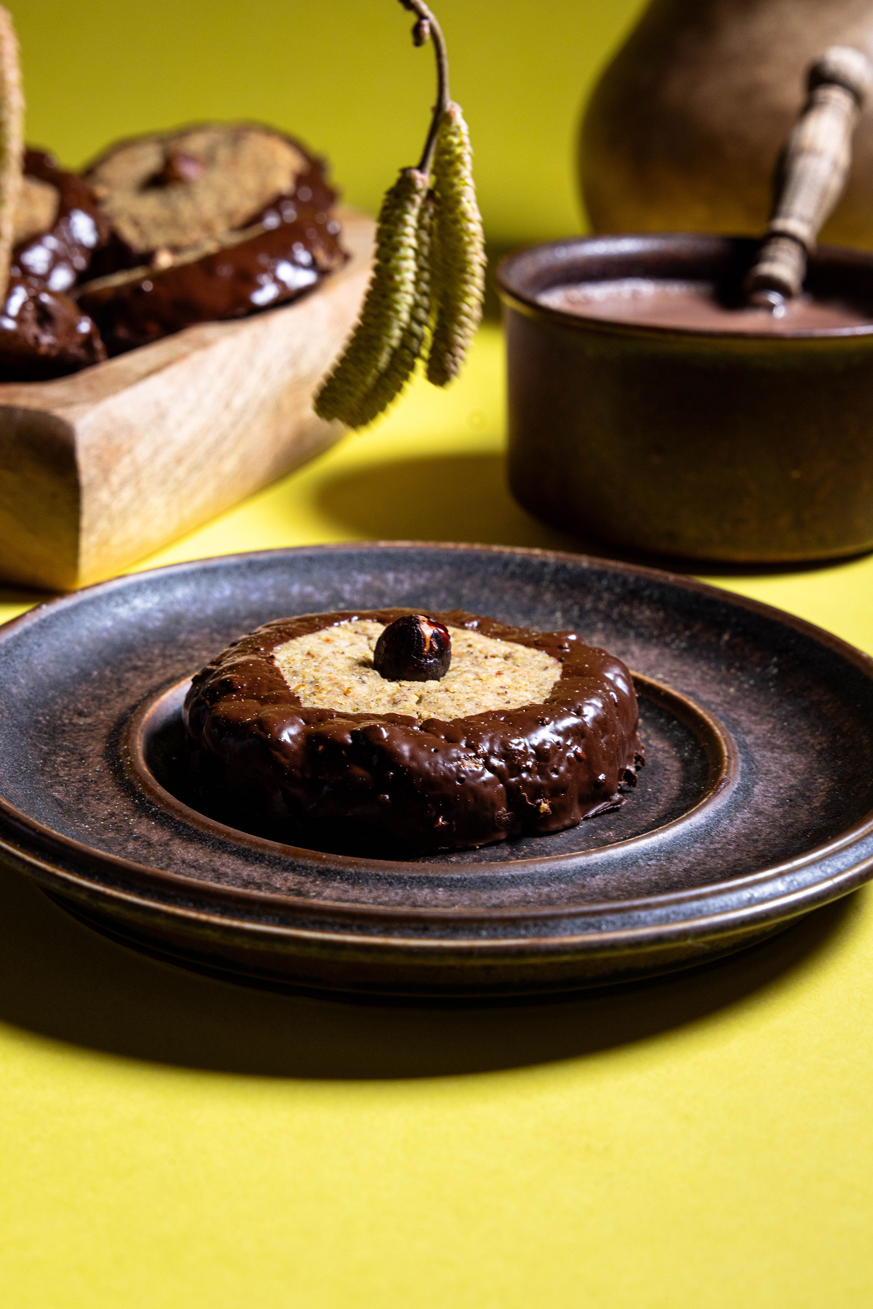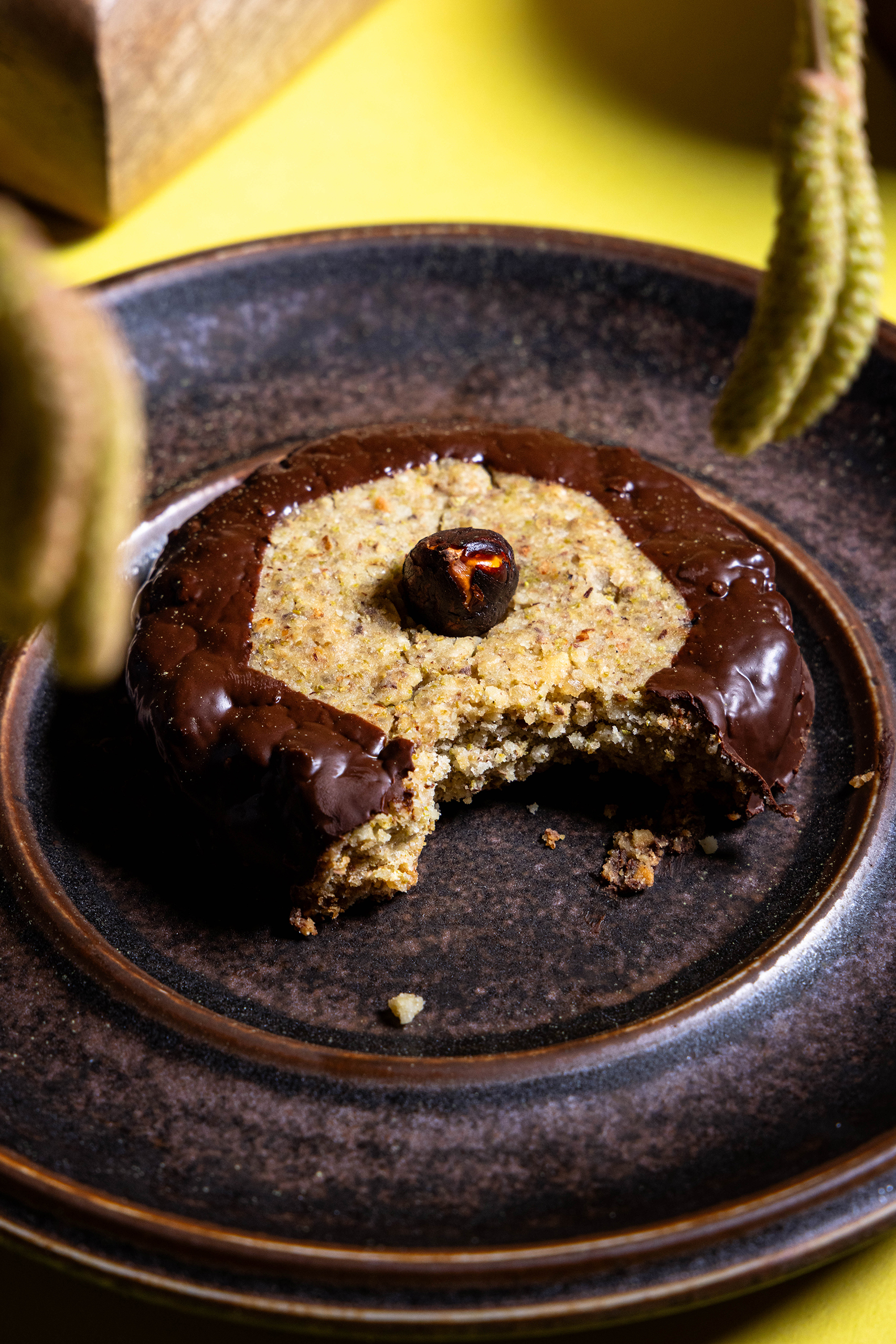 Haselkätzchenplätzchen -Das Haselkätzchenmehl gibt den Plätzchen eine besondere, leicht bittere Note, die perfekt zur dunklen Schokolade passt.