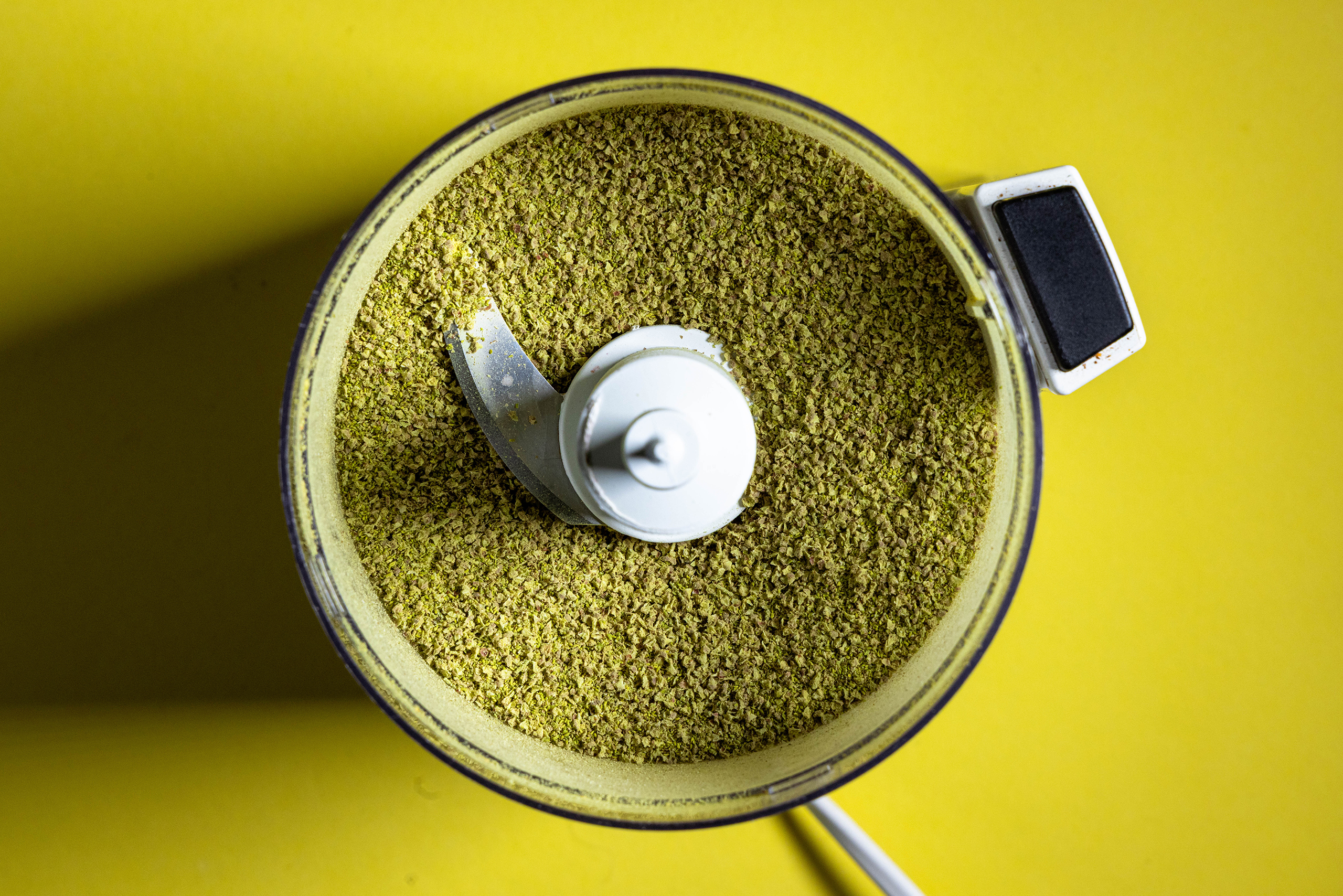 Haselkätzchenmehl, frisch gemahlen, in einer Küchenmaschine.