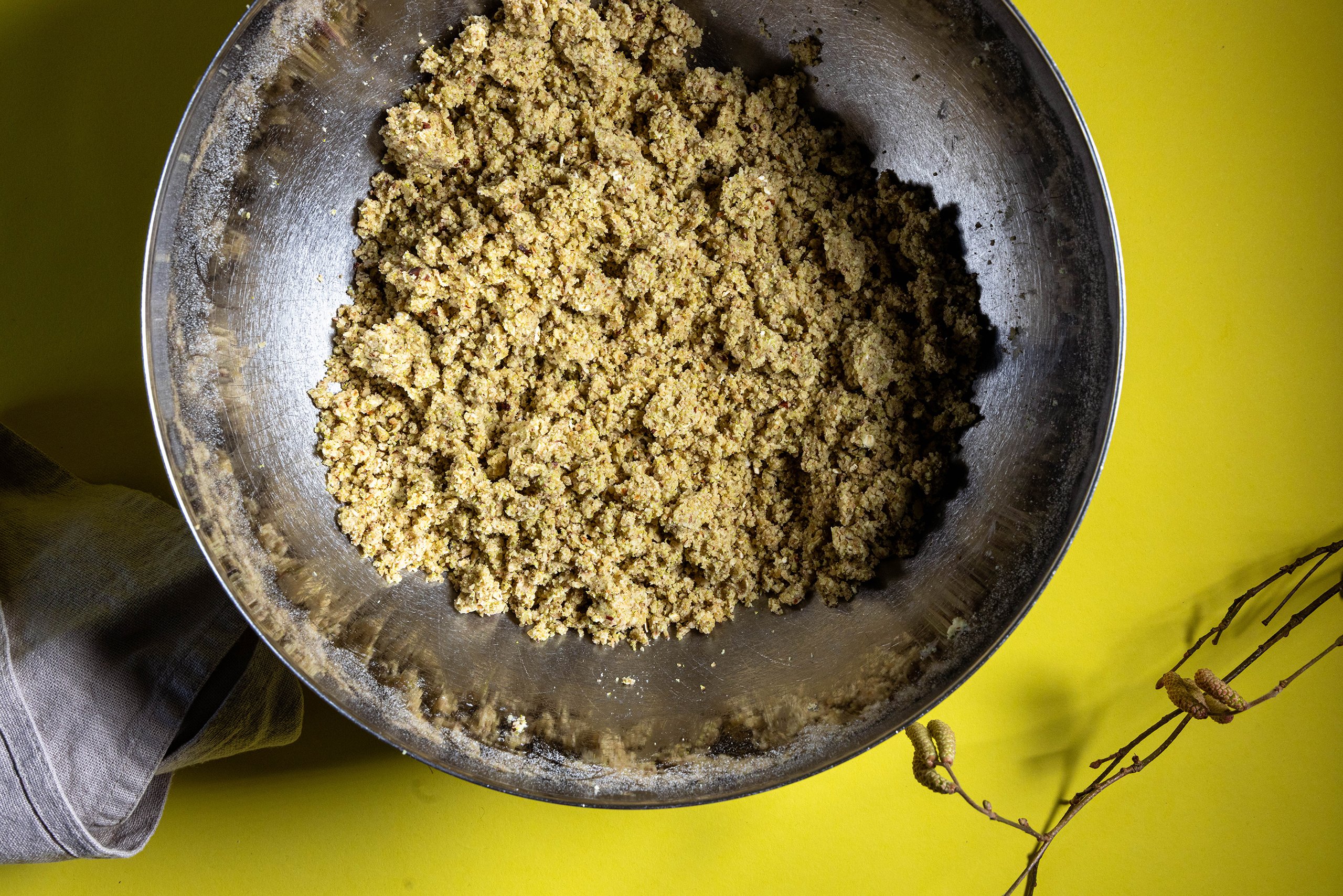 Ein Haselnussmürbeteig mit Haselkätzchenmehl wird zubereitet.