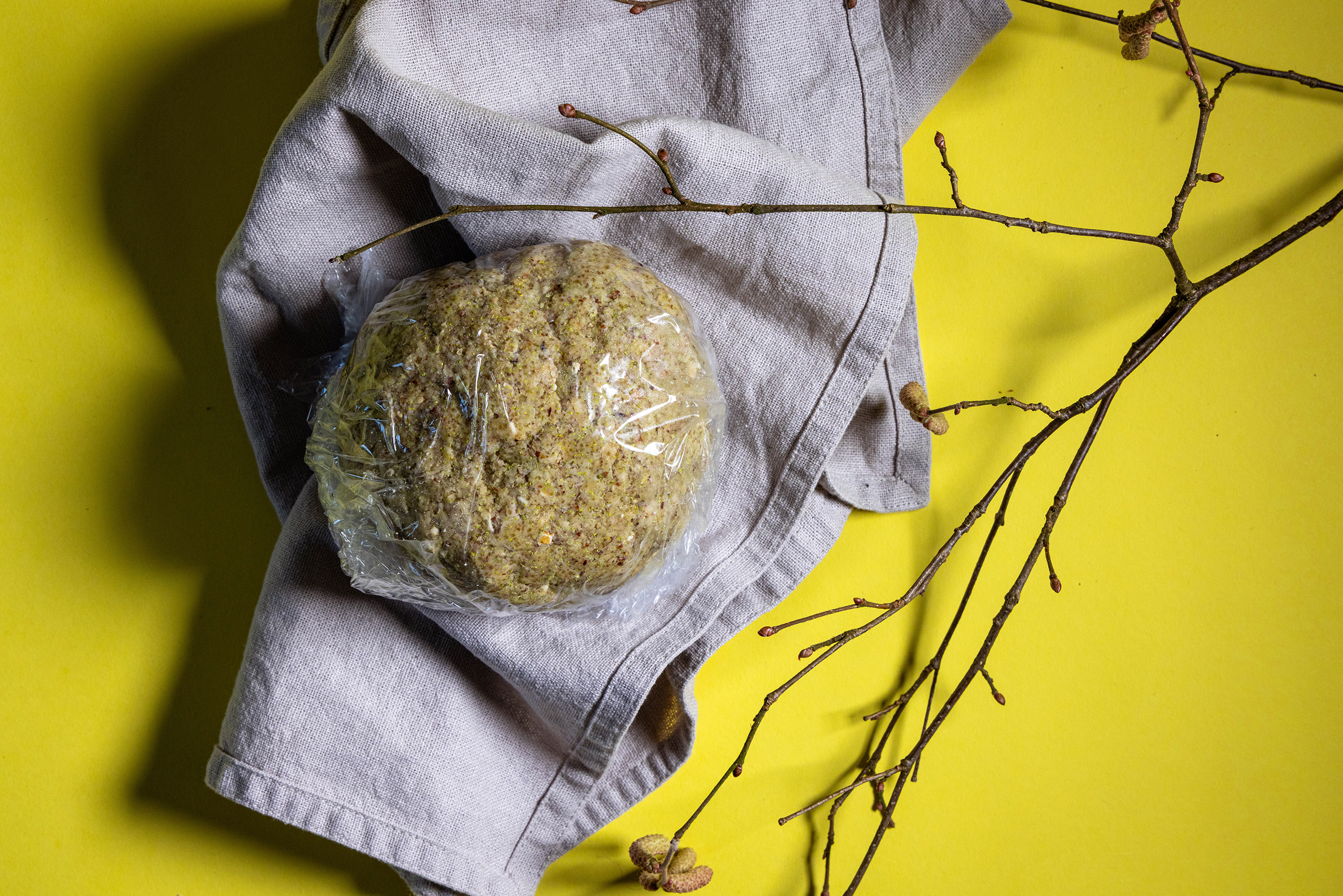 Haselnussplätzchenteig mit Haselkätzchenmehl in Frischhaltefolie gewickelt.