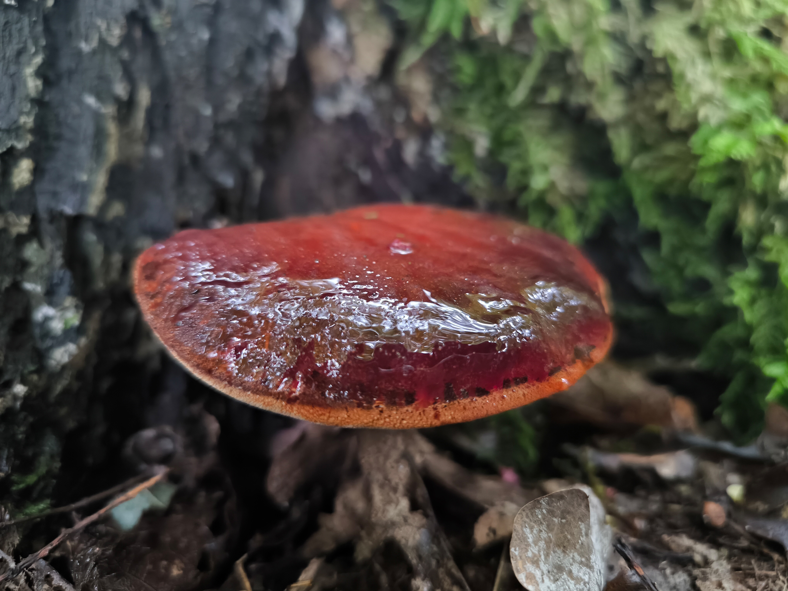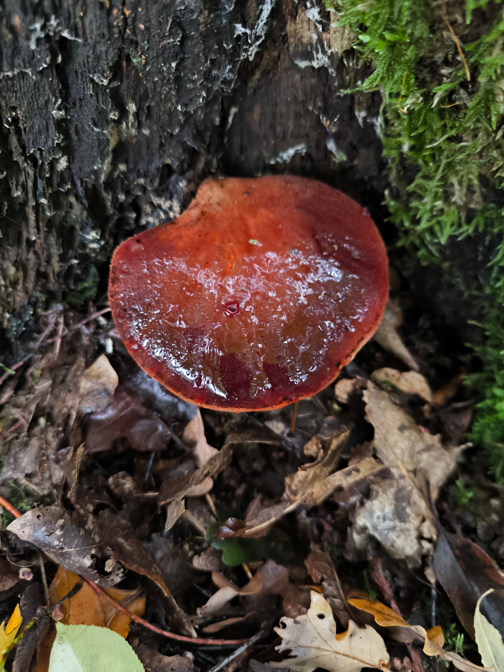 Die Oberfläche ist von einem Schleimfilm überzogen. Die Oberfläche sondert ein schleimig-klebriges, rötliches Sekret ab. Dieses ‚blutet‘ auch gerne noch nach dem Sammeln in den Pilzkorb.