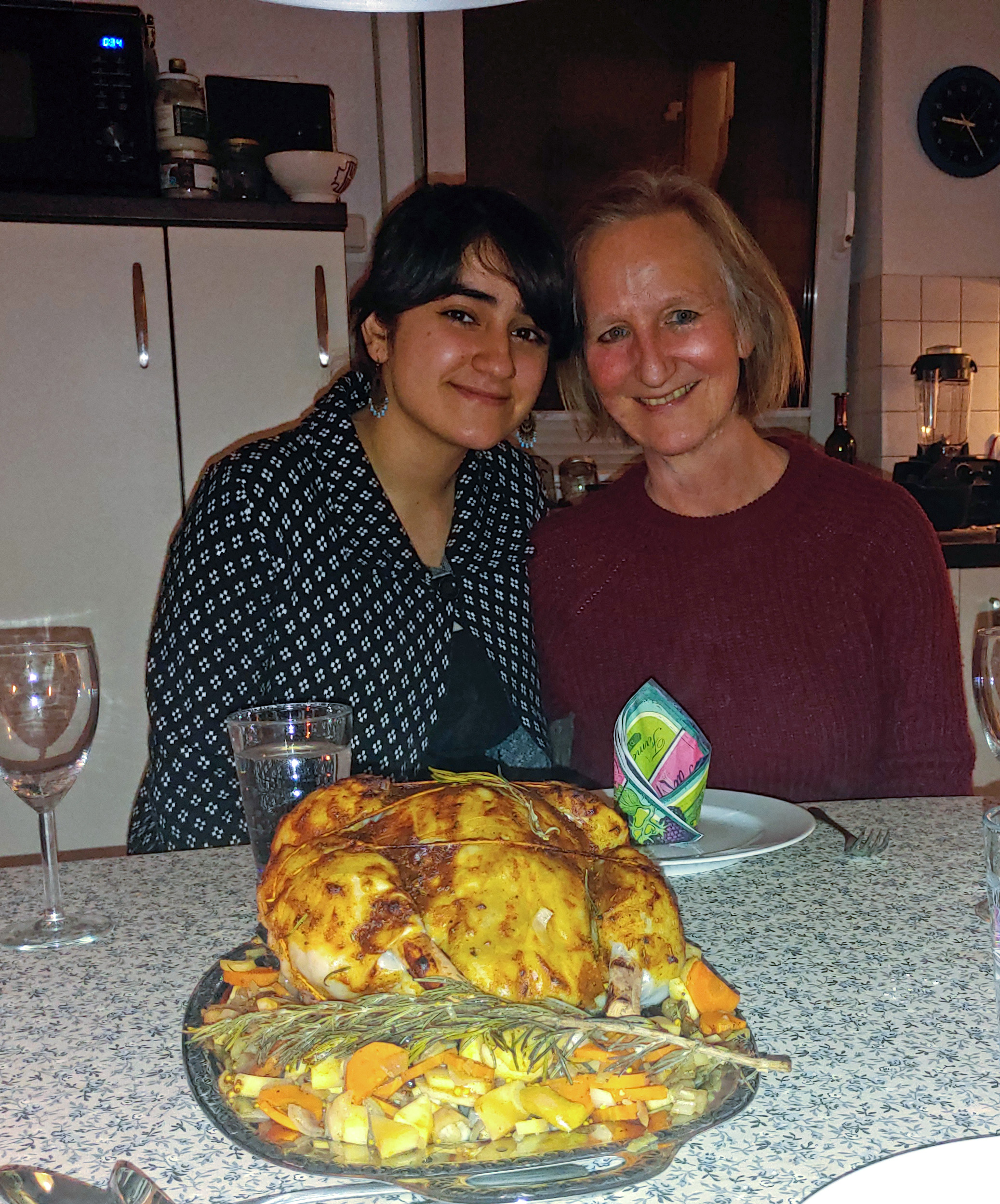Das war wirklich ein irres Ding, wir haben 5 Stunden lang geschnippelt, gebraten, geformt, geklebt…uns schlapp gelacht…Fotos für die Tochter bzw. Freundin in Schottland gemacht. Das Ergebnis sah toll aus! Es wurde festlich aufgetischt: mit Rotkohl und Klößen, abgerundet mit einem feinen Glas Rotwein. Leider mag ich keine Jackfruit (was ich erst an diesem Abend festgestellt habe), dennoch hat es geschmeckt.