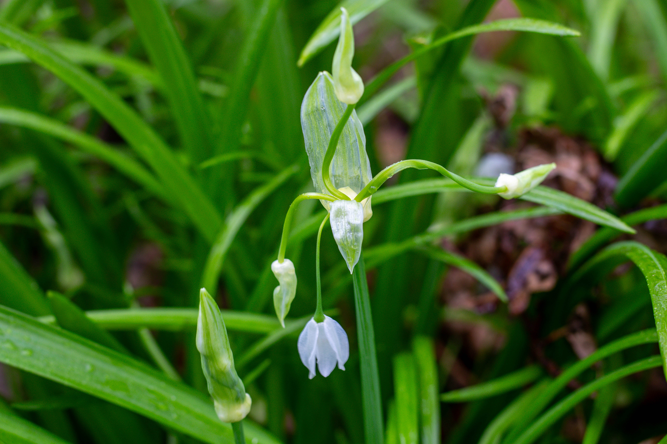 In der Mitte der Pflanze bildet sich nach einigen Wochen eine Knospe, die an einem aufrechten Blütenstandstiel mit weiß-gelblichen Blüten heranwächst. So ein Blütenstiel hat zwei bis fünf nickende, glockenförmige Blüten, die insgesamt etwas ungewohnt aussehen und von der Knospe bis zur Blüte ganz schöne Transformer-Blüten sind (Transformer-Blüten ist kein Fachbegriff).
